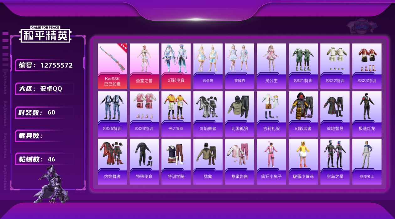 - [11609140]4粉装 9特效枪 5印记 可二次 可修改实名 优质装备:奇异狩猎者,宝贝奶油派,AKM绿萝繁花,SCAR-L-锦绣绵绵,M416电玩时刻,七级PKM-守护天翼,PKM-守护天翼,GROZA-镜光银凌,AUG-暖羊咩咩,星穹咏叹调,MK14-甜梦熊击,狂魅哈莉,Kar98K-巳巳如意 热门装扮:飒粉甜心,大橘为重,呆萌铁蟹 稀有枪皮:DP-28-豹影疾电 五级特效枪:五级GROZA-镜光银凌,五级Kar98K-巳巳如意,五级MK14-甜梦熊击,五级AUG-暖羊咩咩,五级M416-电玩时刻,五级SCAR-L-锦绣绵绵,五级AKM-绿萝繁花 一级特效枪:一级DP-28-豹影疾电 紫色装扮:田园牧歌,轻风白浪,和煦暖阳,SS22特训,飞狐塔尔斯,SS23特训,幻彩翩翩,妙红点点,娇憨猪猪,萌趣咩咩,SS21特训,SS31特训套装,人气偶像,冰川特警,冷焰舞者,霓虹热舞,SS30特训套装,云朵鹅,雪绒豹,SS33特训套装,混沌火种,SS20特训,SS15特训,SS16特训,SS13特训,治愈之星,科技之星,SS14特训,萌趣颜团子,特种颜团子,英勇保护者,吉莉礼服,甜心亚梦,虚音幻奏,瑞龙福将,团圆交子,SS17特训,SS18特训,野性战心,长空猛禽,荣耀,荧惑魅影,蓝彩潮人,虎虎生威吉莉,街头潮人,飞行日记,龙腾端午,骑行爱好者,魅力单车,鹤鸣,麻辣教官,龙的传人,冰河战士,龙魂突击队,香桃花海,极地朋克,柠萌假日,格斗先锋,海岛探路者,涂山之恋,深蓝色名流,暗黑骑手,滨海假日,幻世战舞者,怒火燎原,探宝勇士,滨海厨神,白熊同盟,白色伏地魔,破晓战魂,竞技达人朋克,王牌教练,牛气冲天,热血青春,牛气满满,特战装甲,星途旅人,纯真浪花,热情海星,SS28特训,冰公主,鱼渊荷华,玉兔迎春,燕燕于飞,巳巳如意,竞技名士,街头风暴,怀庆长公主,惊鸿侠骨,神气柴柴,懵萌河马,SS24特训(SS24特训套装),萤火魅影(套装-荧惑魅影),SS25特训,绝对偶像,锦衣飞扬,粉红小猪,焰鹰斗篷,幻羽潜行,SS27特训,小丑鱼,SS26特训,春光漫游,快闪甜心,智谋强哥,核芯基因,大橘大利,星影赞美诗,抹茶蜜豆,智慧之神,SS10特训,SS11特训,蓝冰羽,紫幽梦,SS32特训服(SS32特训套装),青玉碎影,绯格组合,萌黄之夏,白糯汤圆,蓝调潮人,光之冒险,海上生明月 优质战备:星梦奇缘