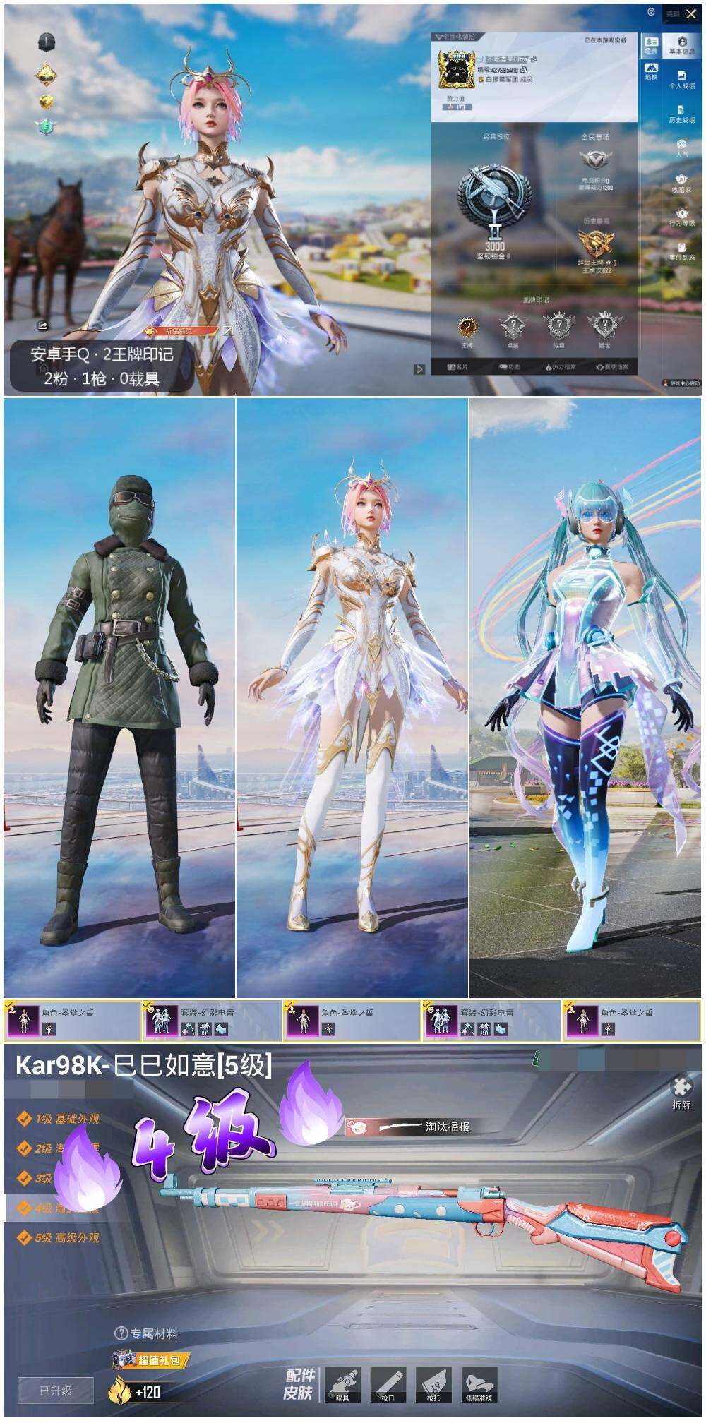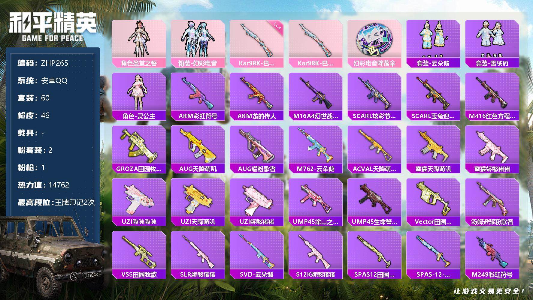 [12755572]安卓 手Q-2粉装-1特效枪-1.4w热力值-2王牌印记-60套装-46枪皮【粉色套装】:角色-圣堂之誓,粉装-幻彩电音【粉色枪皮等级】:Kar98K-巳巳如意(四级)