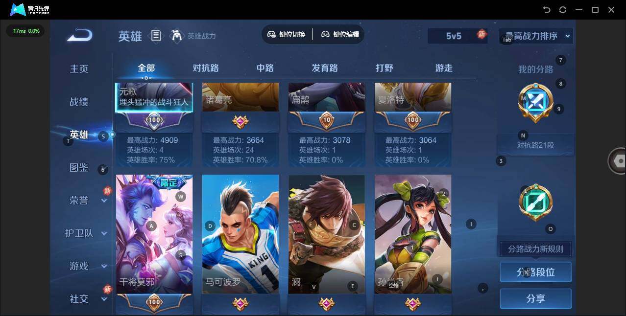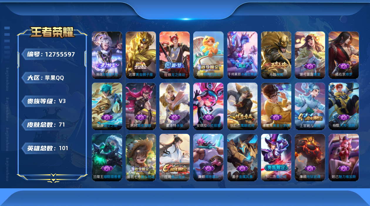 - [12090515]V7 1无双 20传说 125英雄 281皮肤 可修改实名 优质装备:器灵·螭龙剑,黄金狮子座,黄金射手座,云鹰飞将(小将军),绛天战甲(鸡嘴战神),久胜战神,炽阳神光,一念神魔,零号·赤焰,地狱之眼,时之恋人-刘备(电焊工),游龙清影(小青龙),超时空战士-狄仁杰,惊梅引,澜逐花归海 传说皮:落雪白狼,祥瑞亨通,幻光神枪 珍宝阁皮:万物之道,蔷薇恋人,女武神 限定皮:鸣野蒿,武陵仙君(小桃花),傲雪梅枪,神威(电光马子),遇见飞天,高山流水,五谷丰年,游园惊梦,梁祝,祈雪灵祝(雪兔子),天狼绘梦者,李小龙,霸王别姬-项羽,山海·玄木吟(马可年限) 史诗皮:器灵·浮梦炉,星界战将,破空之剑,琥珀纪元伽罗,百相守梦-百里守约,百相守梦-黄忠,遇见神鹿,紫霞仙子,黄金分割率,特工魅影,永昼,江河有灵,雪夜绮愿(周瑜),魅语,百解令(蒙犽),蒙恬荣光圣徽,无限星赏官,冰冠公主,晚萤,电玩·爆裂旋风,暗夜猫娘,末日机甲-吕布,猫狗日记-孙策,乱世虎臣,节奏热浪,修罗,女仆咖啡,摇滚巨星,水果甜心,绅士熊喵,天才门将,星夜王子,德古拉伯爵,幽灵船长,鬼剑武藏,暗渊魔法,舞动绿茵,地狱岩魂,纤云弄巧,拒霜思,缤纷独角兽,月团寄思,水晶猎龙者,曙光守护者,金属风暴,原初追逐者,圣诞狂欢,圣诞恋歌,鹰眼统帅,暗夜贵公子,魅力维加斯,黎明之约,无心