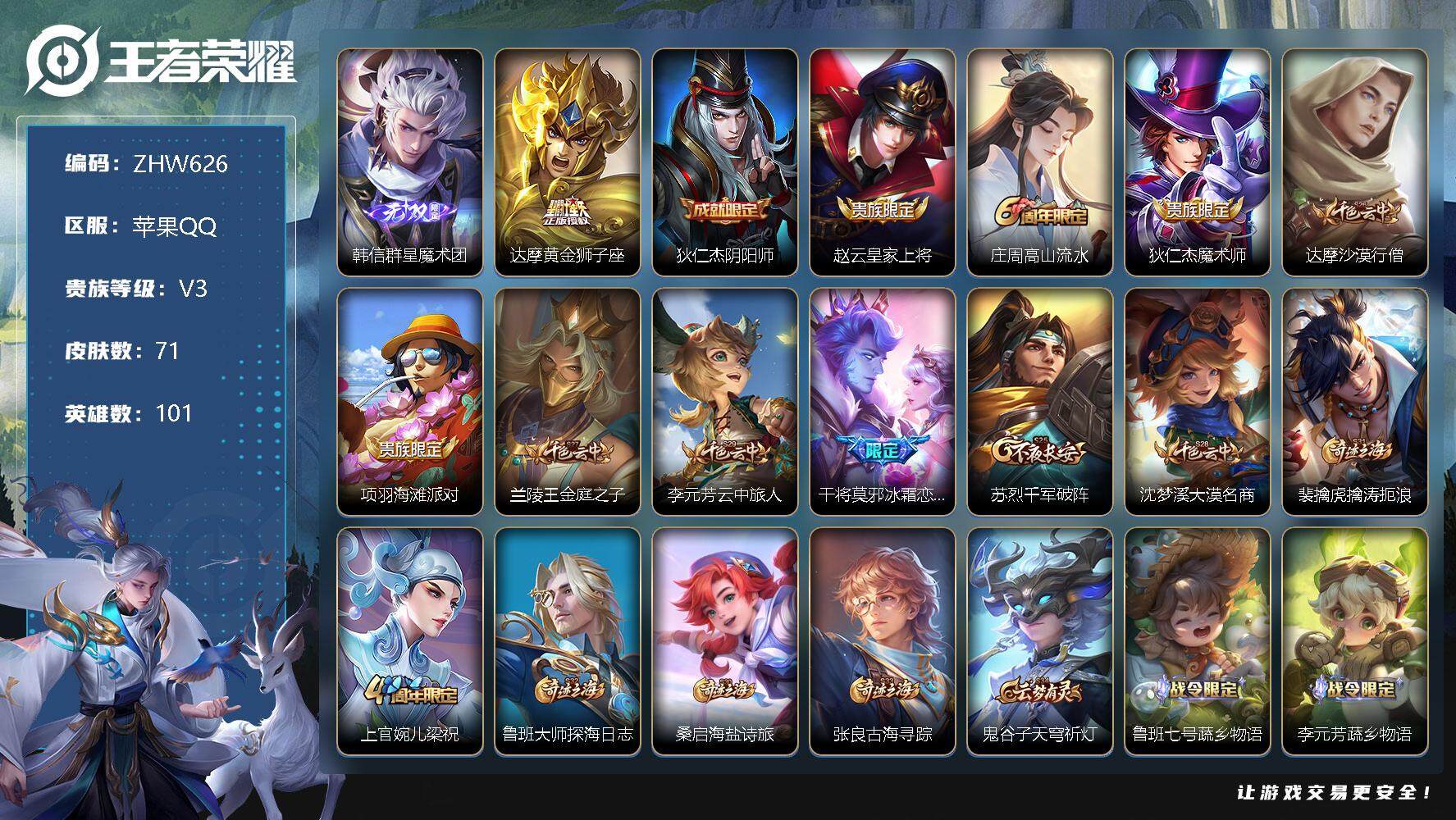 [12755597]【特价急出/详情看图】苹果Q-V3-至尊星耀IV段位-101英雄-71皮肤-1无双-1传说-24史诗 【无双皮肤】:韩信群星魔术团 【传说皮肤】:达摩黄金狮子座 【限定皮肤】:狄仁杰阴阳师,赵云皇家上将,庄周高山流水,狄仁杰魔术师,达摩沙漠行僧,项羽海滩派对,兰陵王金庭之子,李元芳云中旅人,干将莫邪冰霜恋舞曲,苏烈千军破阵,沈梦溪大漠名商,裴擒虎擒涛扼浪,上官婉儿梁祝,鲁班大师探海日志,桑启海盐诗旅,张良古海寻踪,鬼谷子天穹祈灯,鲁班七号蔬乡物语,李元芳蔬乡物语,刘邦剑破天穹,韩信群星魔术团 【年限皮肤】:马超神威 【赛季限定】:达摩沙漠行僧,兰陵王金庭之子,张良古海寻踪,李元芳云中旅人,苏烈千军破阵,沈梦溪大漠名商,裴擒虎擒涛扼浪,鲁班大师探海日志,桑启海盐诗旅,鬼谷子天穹祈灯,刘邦剑破天穹 【战令限定】:鲁班七号蔬乡物语,李元芳蔬乡物语 【史诗皮肤】:阿轲暗夜猫娘,赵云皇家上将,狄仁杰魔术师,廉颇地狱岩魂,嬴政摇滚巨星,妲己魅力维加斯,墨子金属风暴,兰陵王暗隐猎兽者,诸葛亮黄金分割率,安琪拉心灵骇客,干将莫邪冰霜恋舞曲,狄仁杰鹰眼统帅,上官婉儿梁祝,娜可露露晚萤,橘右京修罗,马超神威,杨戬天秀启明,庄周高山流水,夏洛特永昼,鲁班七号蔬乡物语,廉颇撼地雄心,亚连破空之剑,刘禅鸭鸭历险记,狂铁龙之律动 【其他皮肤】:项羽海滩派对,韩信教廷特使,扁鹊救世之瞳,孙膑天使之翼,亚瑟死亡骑士,花木兰兔女郎,狄仁杰阴阳师,关羽龙腾万里,宫本武藏霸王丸,孙尚香沉稳之力,小乔丁香结,姜子牙炽热元素使,狂铁特工战影,苏烈千军破阵,达摩沙漠行僧,兰陵王金庭之子,沈梦溪大漠名商,李元芳云中旅人,桑启海盐诗旅,裴擒虎擒涛扼浪,鲁班大师探海日志,张良古海寻踪,鬼谷子天穹祈灯,李元芳蔬乡物语,刘邦剑破天穹,孙悟空神迹守卫,典韦铁骨偃魂,钟馗虚灵犬护,沈梦溪鸭鸭历险记,项羽帝国元帅,曹操超能战警,张良天堂福音,周瑜海军大将,马可波罗激情绿茵,鬼谷子阿摩司公爵,百里守约绝影神枪,百里玄策威尼斯狂欢,元歌午夜歌剧院,李信灼热之刃,上官婉儿修竹墨客,曜归虚梦演,马超幸存者,澜孤猎,云缨赤焰之缨,金蝉前尘 【内测皮肤】:狂铁特工战影 【营地ID】:1854975261