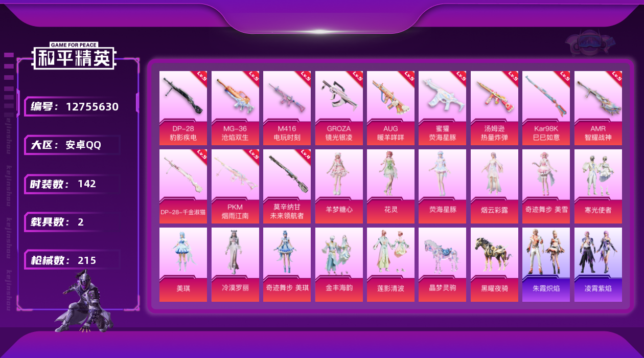 [12755630]【特价!急出!】安卓 手Q-11粉装-13特效枪-2载具-4粉色飞行器-72361热力值-11王牌印记-142套装-215枪皮