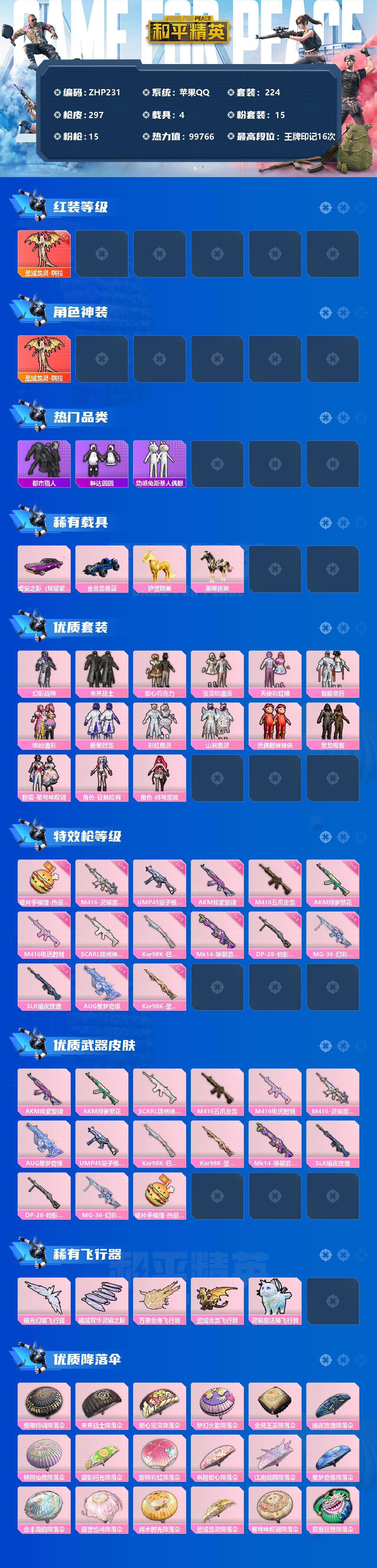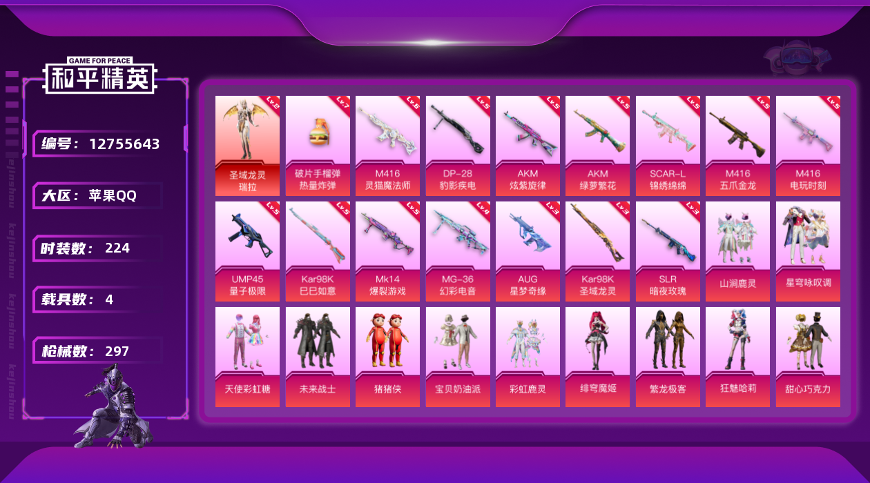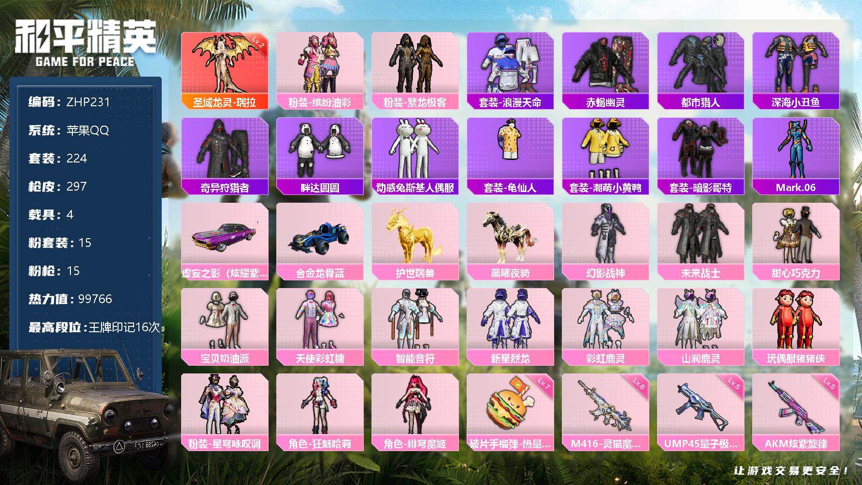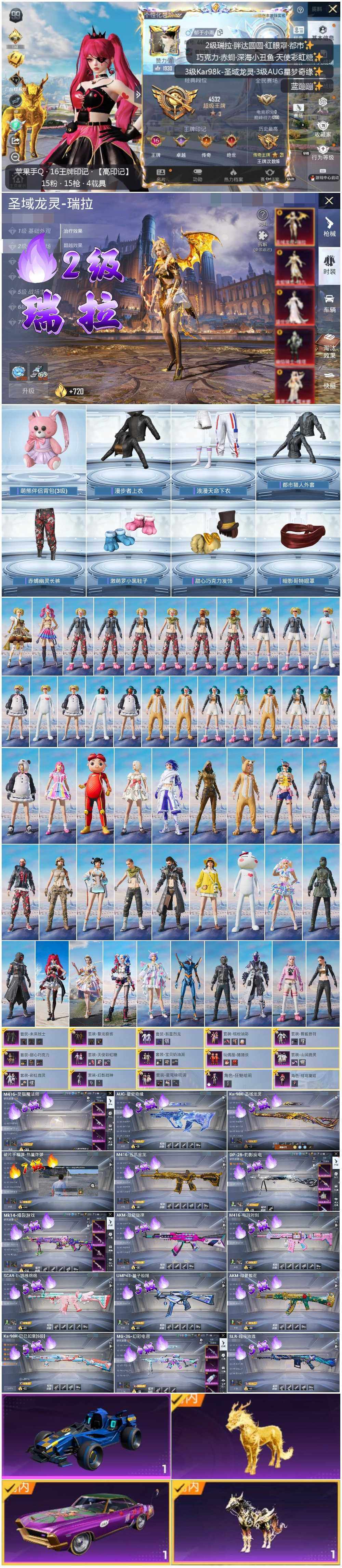 [12755643]2级瑞拉!小丑女!巧克力三姐妹!苹果 手Q-1神装-15粉装-15特效枪-4载具-5粉色飞行器-99766热力值-16王牌印记-224套装-297枪皮 【红色神装等级】:圣域龙灵-瑞拉(二级) 【红色角色神装】:圣域龙灵-瑞拉 【热门品类】:粉装-缤纷油彩,粉装-繁龙极客,套装-浪漫天命,套装-赤蝎幽灵,套装-都市猎人,套装-深海小丑鱼,套装-奇异狩猎者,套装-胖达圆圆,套装-动感兔斯基人偶服,套装-龟仙人,套装-潮萌小黄鸭,套装-暗影哥特,角色-Mark.06 【粉色载具】:虚妄之影(炫耀紫),合金龙骨(蓝),护世瑞兽,黑曜夜骑 【粉色套装】:粉装-幻影战神,粉装-未来战士,粉装-甜心巧克力,粉装-宝贝奶油派,粉装-天使彩虹糖,粉装-智能音符,粉装-缤纷油彩,粉装-新星烈龙,粉装-彩虹鹿灵,粉装-山涧鹿灵,玩偶服-猪猪侠,粉装-繁龙极客,粉装-星穹咏叹调,角色-狂魅哈莉,角色-绯穹魔姬 【粉色枪皮等级】:AKM-炫紫旋律(五级),AKM-绿萝繁花(五级),SCAR-L-锦绣绵绵(五级),M416-五爪金龙(五级),M416-电玩时刻(五级),M416-灵猫魔法师(六级),AUG-星梦奇缘(三级),UMP45-量子极限(五级),Kar98K-巳巳如意(五级),Kar98K-圣域龙灵(三级),Mk14-爆裂游戏(五级),SLR-暗夜玫瑰(三级),DP-28-豹影疾电(五级),MG-36-幻彩电音(四级),破片手榴弹-热量炸弹(七级) 【粉色枪皮】:AKM-炫紫旋律,AKM-绿萝繁花,SCAR-L-锦绣绵绵,M416-五爪金龙,M416-电玩时刻,M416-灵猫魔法师,AUG-星梦奇缘,UMP45-量子极限,Kar98K-巳巳如意,Kar98K-圣域龙灵,Mk14-爆裂游戏,SLR-暗夜玫瑰,DP-28-豹影疾电,MG-36-幻彩电音,破片手榴弹-热量炸弹 【粉色飞行器】:镜光幻境飞行翼,镜域双华-灵镜之阶,万象金身飞行器,圣域金龙飞行器,灵猫魔法师飞行器 【粉色降落伞】:极限特训降落伞,未来战士降落伞,甜心宝贝降落伞,梦幻火箭降落伞,金风玉露降落伞,暗夜玫瑰降落伞,林间仙鹿降落伞,碧影闪光降落伞,旋转彩虹降落伞,飒粉甜心降落伞,江南烟雨降落伞,星梦奇缘降落伞,金丰海韵降落伞,盛世惊鸿降落伞,戏水时光降落伞,圣域龙灵降落伞,星穹咏叹调降落伞,双重狂想降落伞,最终圣卫