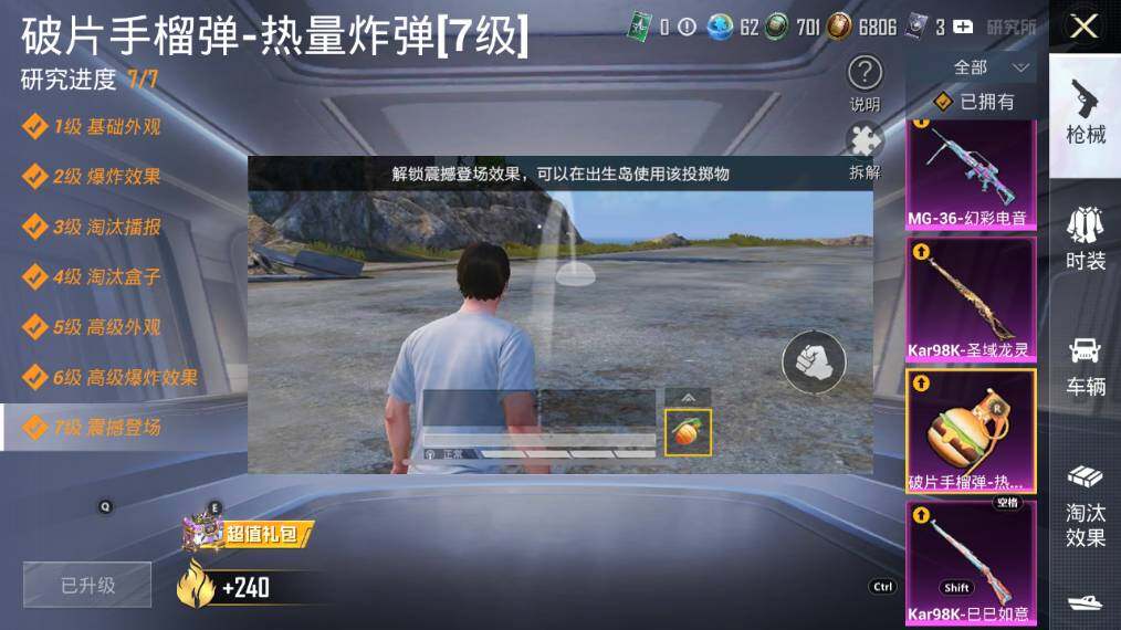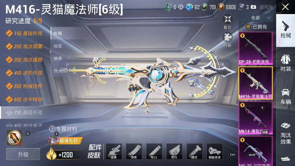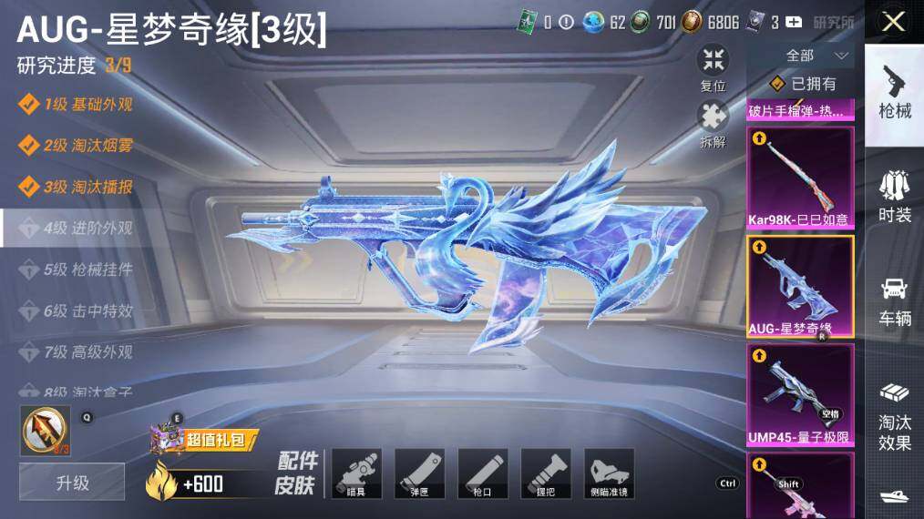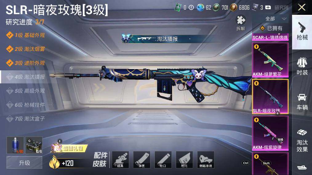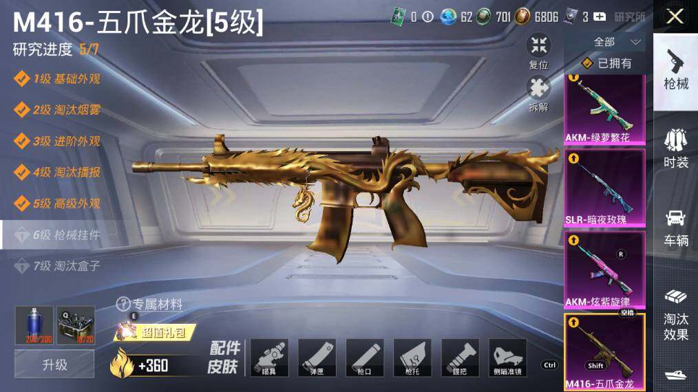 AKM-炫紫旋律,AKM-绿萝繁花,M416-五爪金龙,M416-电玩时刻,AUG-星梦奇缘,UMP45-量子极限,Kar98K-巳巳如意,Kar98K-圣域龙灵,SLR-暗夜玫瑰,破片手榴弹-热量炸弹
