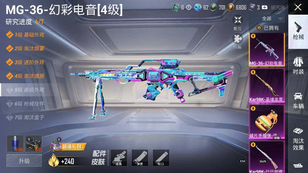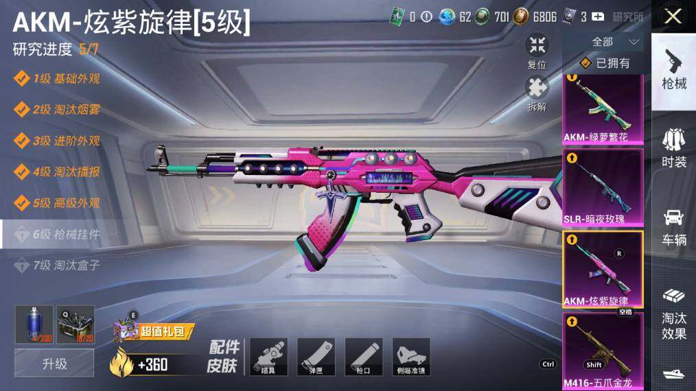 【粉色枪皮等级】:AKM-炫紫旋律(五级),AKM-绿萝繁花(五级),SCAR-L-锦绣绵绵(五级),M416-五爪金龙(五级),M416-电玩时刻(五级),M416-灵猫魔法师(六级),AUG-星梦奇缘(三级),UMP45-量子极限(五级),Kar98K-巳巳如意(五级),Kar98K-圣域龙灵(三级),Mk14-爆裂游戏(五级),SLR-暗夜玫瑰(三级),DP-28-豹影疾电(五级),MG-36-幻彩电音(四级),破片手榴弹-热量炸弹(七级)