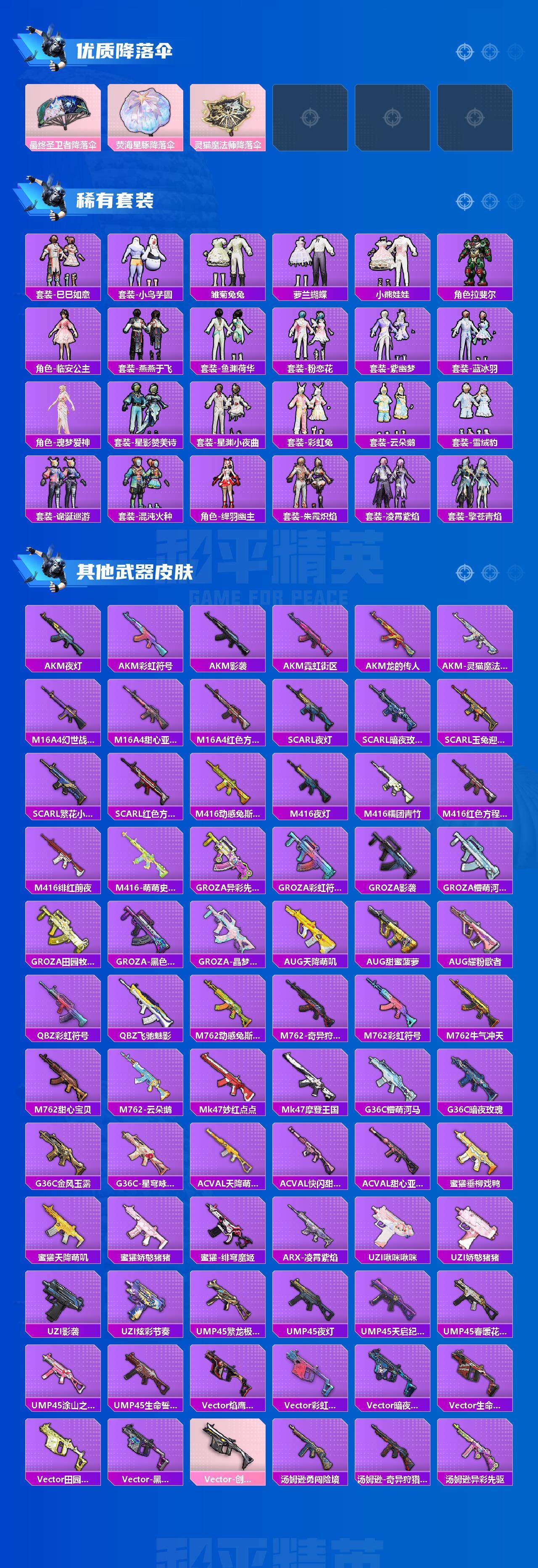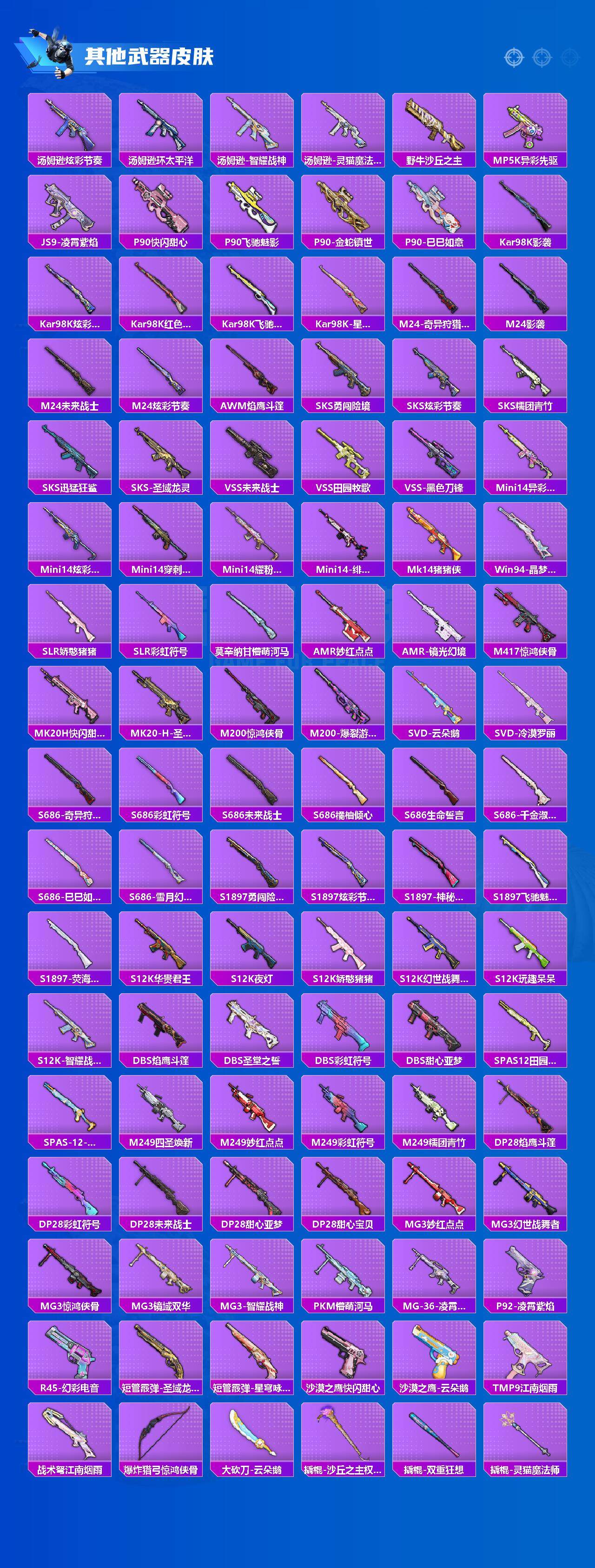 【粉色枪皮】:AKM-炫紫旋律,AKM-绿萝繁花,SCAR-L-锦绣绵绵,M416-五爪金龙,M416-电玩时刻,M416-灵猫魔法师,AUG-星梦奇缘,UMP45-量子极限,Kar98K-巳巳如意,Kar98K-圣域龙灵,Mk14-爆裂游戏,SLR-暗夜玫瑰,DP-28-豹影疾电,MG-36-幻彩电音,破片手榴弹-热量炸弹