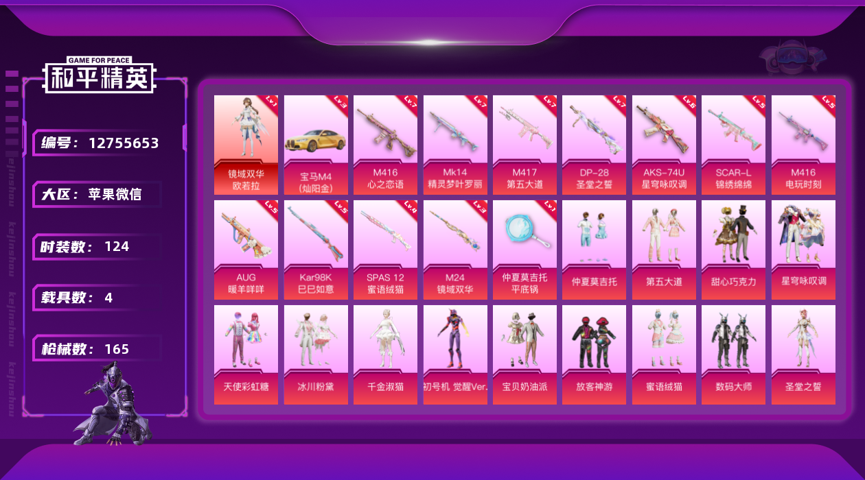 [12755653]欧若拉!宝马M4!苹果 微信-1神装-14粉装-12特效枪-4载具-4粉色飞行器-68735热力值-8王牌印记-124套装-165枪皮