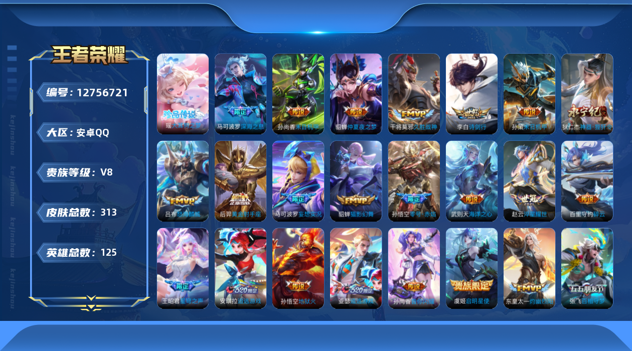 [12756721]安卓Q-V8-最强王者段位-125英雄-313皮肤-0典藏-0珍品无双-0无双-1珍品传说-23传说-89史诗