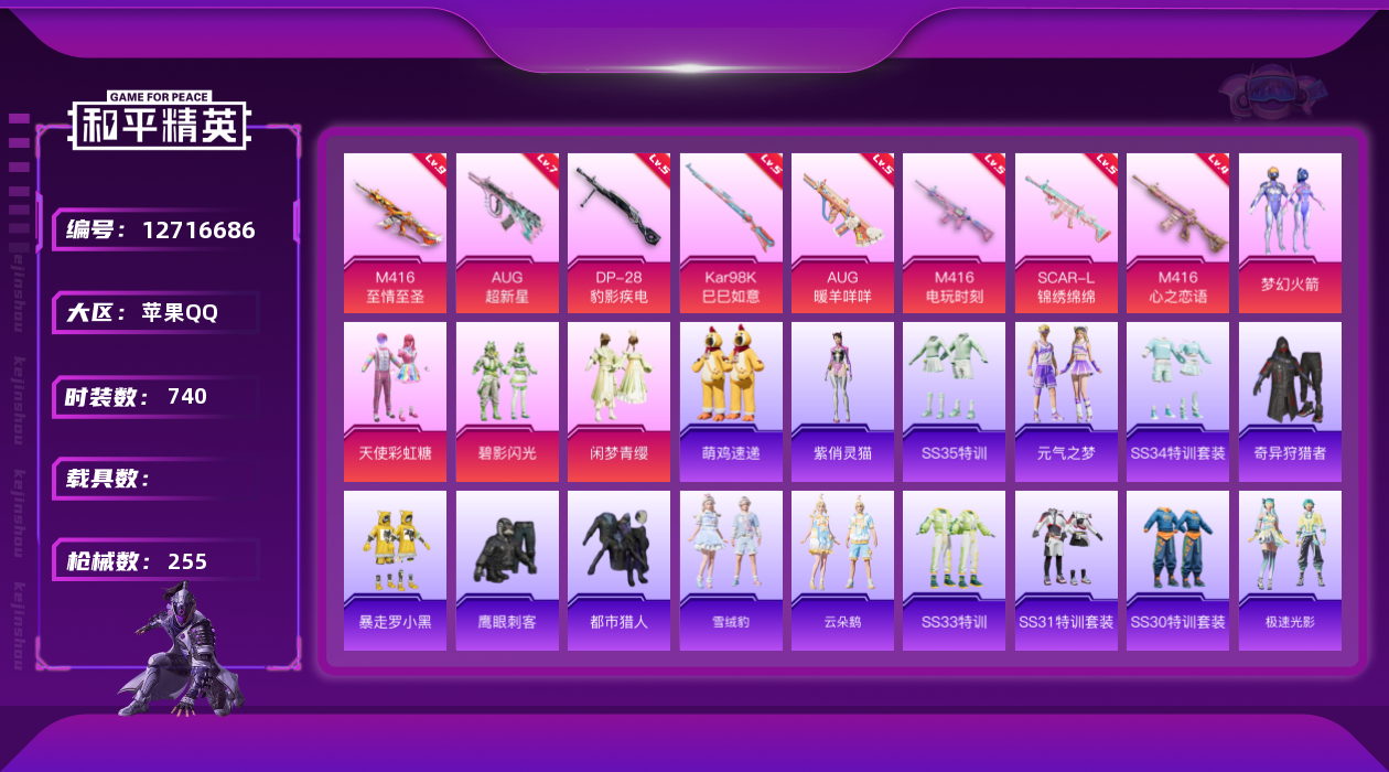 [12716686]实名: 可修改 时装数: 740 枪械数: 255 战备数: 196 热门装扮: 奇异狩猎者,梦幻火箭(新101),天使彩虹糖,鹰眼刺客,都市猎人,碧影闪光,暴走罗小黑,闲梦青缨 稀有枪皮: M416心之恋语,M416至情至圣,AUG超新星,SCAR-L-锦绣绵绵,M416电玩时刻,Kar98K-巳巳如意,AUG-暖羊咩咩,DP-28-豹影疾电
