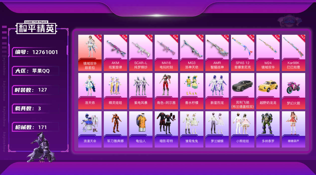 [12761001]苹果 手Q-1神装-7粉装-8特效枪-3载具-3粉色飞行器-61404热力值-13王牌印记-127套装-171枪皮 【红色神装等级】:镜域双华-欧若拉(三级) 【红色角色神装】:镜域双华-欧若拉 【热门品类】:粉装-梦幻火箭,套装-浪漫天命,角色-军刀雅典娜,套装-龟仙人,套装-暗影哥特,套装-浪漫波比 【粉色载具】:宾利飞驰(布罗德盖棕双色),越野奶龙龙,双人摩托-梦幻火箭 【粉色套装】:粉装-梦幻火箭,粉装-新星烈龙,粉装-香水柠檬,角色-洛天依,粉装-精灵娃娃,粉装-紫电风暴,角色-阿尔茜 【粉色枪皮等级】:AKM-炫紫旋律(五级),SCAR-L-纯梦嫁纱(五级),M416-电玩时刻(五级),Kar98K-巳巳如意(一级),M24-镜域双华(二级),AMR-智耀战神(四级),SPAS-12-音爆索尼克(四级),MG3-洛神天依(五级) 【粉色枪皮】:AKM-炫紫旋律,SCAR-L-纯梦嫁纱,M416-电玩时刻,Kar98K-巳巳如意,M24-镜域双华,AMR-智耀战神,SPAS-12-音爆索尼克,MG3-洛神天依 【粉色飞行器】:梦幻火箭飞行器,冷魅冰骑飞行器,镜域双华-灵镜之阶 【粉色降落伞】:梦幻火箭降落伞,香水柠檬降落伞,洛神天依降落伞,甜心娃娃降落伞,冷魅冰骑降落伞,妙趣可丽降落伞,环太平洋降落伞,旋转彩虹降落伞,纯梦嫁纱降落伞,仲夏莫吉托降落伞,白勺歌姬降落伞,圣堂之誓降落伞,镜域双华降落伞,星梦奇缘降落伞,守护天翼降落伞 【稀有套装】:套装-龟仙人,套装-雏菊兔兔,套装-萝兰蝴蝶,套装-小熊娃娃,角色-多纳泰罗,套装-糖糖葫芦,套装-青团波波,套装-燕燕于飞,套装-鱼渊荷华,套装-星渊小夜曲 【稀有枪皮】:AKM-彩虹符号,AKM-环太平洋,AKM-破晓战魂,AKM-龙的传人,M16A4-幻世战舞者,M16A4-甜心亚梦,SCAR-L-炫彩节奏,SCAR-L-玉兔迎春,SCAR-L-红色方程式,M416-暗夜行者,M416-糯团青竹,M416-红色方程式,GROZA-彩虹符号,GROZA-懵萌河马,GROZA-田园牧歌,GROZA-酷泡奶龙,AUG-圣光天使,AUG-天降萌叽,AUG-闲梦青缨,QBZ-洛神天依,M762-天降萌叽,M762-彩虹符号,M762-暗夜鎏金,Mk47-妙红点点,Mk47-洛神天依,G36C-镜域双华,G36C-懵萌河