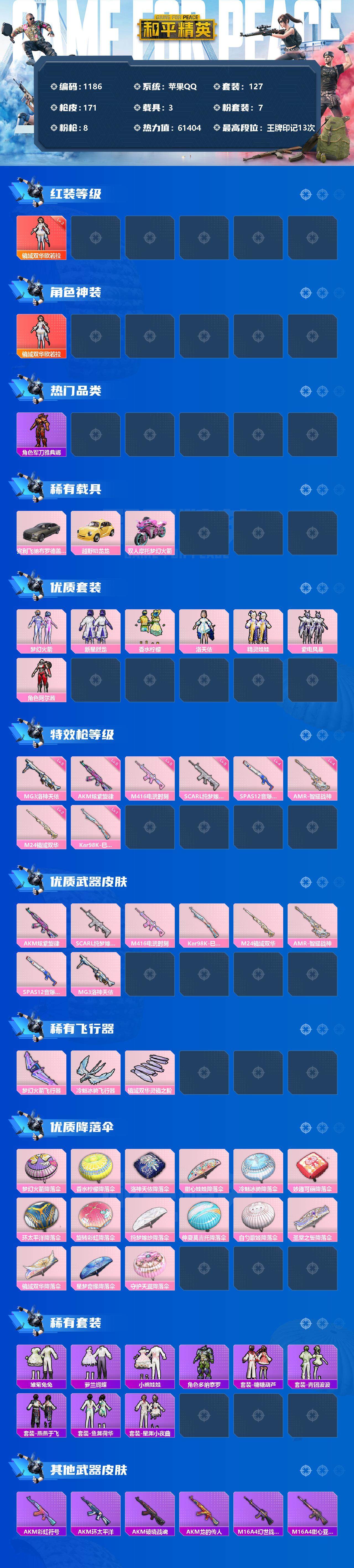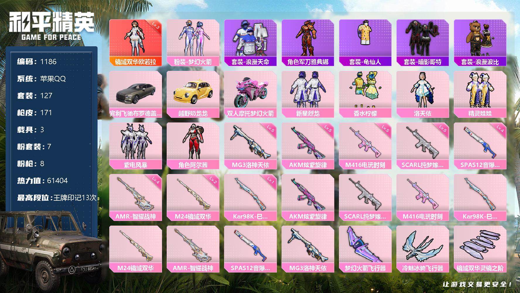 [12761001]苹果 手Q-1神装-7粉装-8特效枪-3载具-3粉色飞行器-61404热力值-13王牌印记-127套装-171枪皮