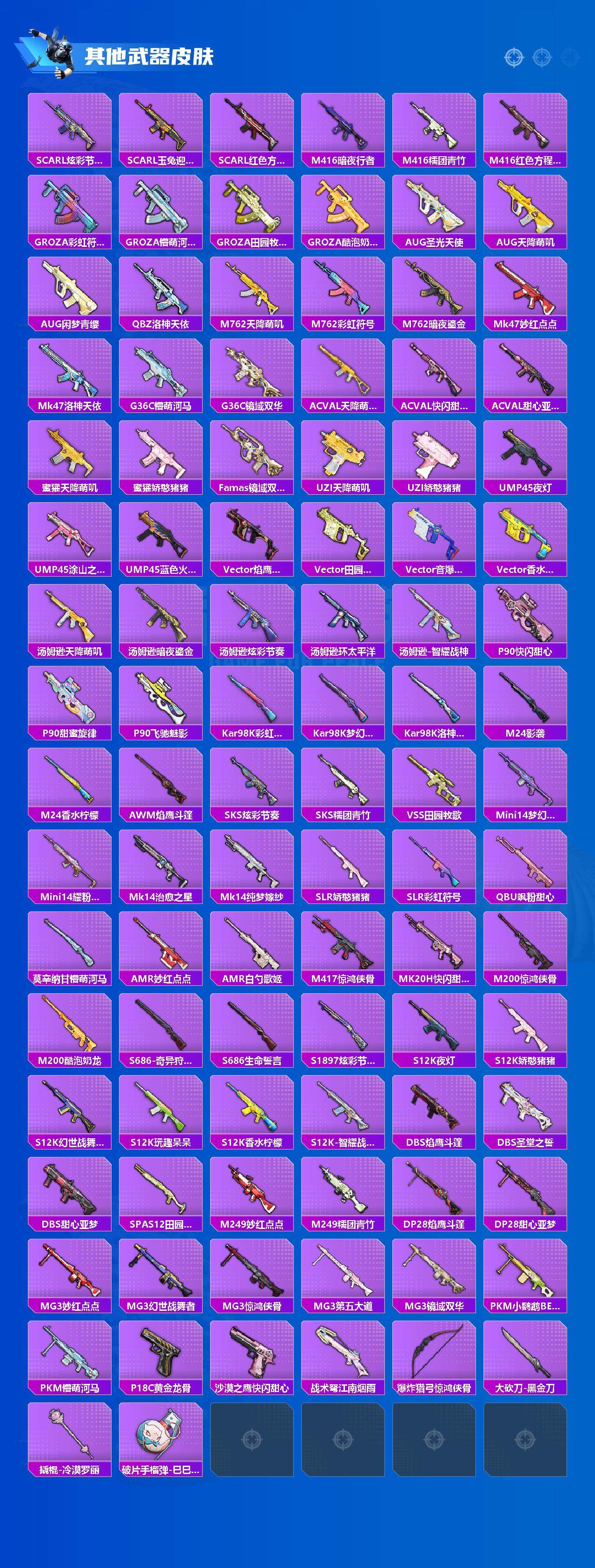 【稀有枪皮】:AKM-彩虹符号,AKM-环太平洋,AKM-破晓战魂,AKM-龙的传人,M16A4-幻世战舞者,M16A4-甜心亚梦,SCAR-L-炫彩节奏,SCAR-L-玉兔迎春,SCAR-L-红色方程式,M416-暗夜行者,M416-糯团青竹,M416-红色方程式,GROZA-彩虹符号,GROZA-懵萌河马,GROZA-田园牧歌,GROZA-酷泡奶龙,AUG-圣光天使,AUG-天降萌叽,AUG-闲梦青缨,QBZ-洛神天依,M762-天降萌叽,M762-彩虹符号,M762-暗夜鎏金,Mk47-妙红点点,Mk47-洛神天依,G36C-镜域双华,G36C-懵萌河