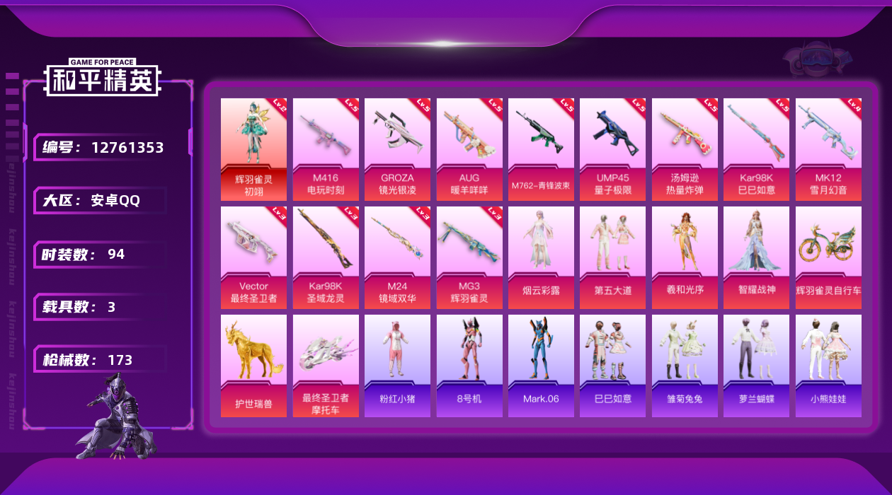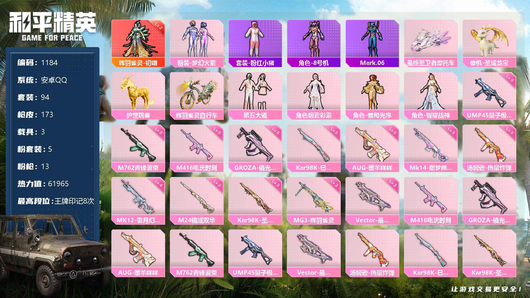 [12761353]安卓 手Q-1神装-5粉装-13特效枪-3载具-9粉色飞行器-61965热力值-8王牌印记-94套装-173枪皮
