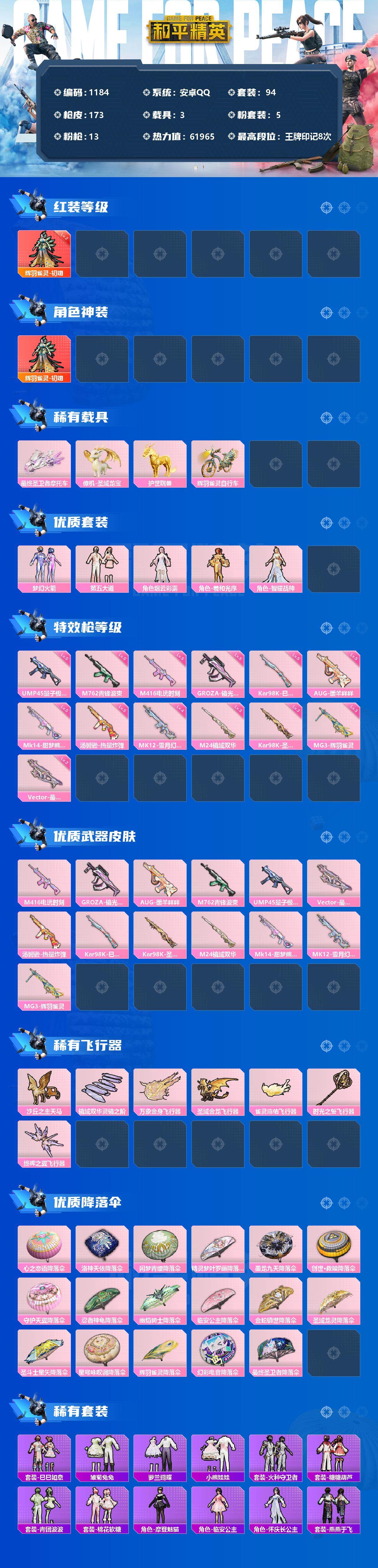 [12761353]安卓 手Q-1神装-5粉装-13特效枪-3载具-9粉色飞行器-61965热力值-8王牌印记-94套装-173枪皮 【红色神装等级】:辉羽雀灵-初翊(二级) 【红色角色神装】:辉羽雀灵-初翊 【热门品类】:粉装-梦幻火箭,套装-粉红小猪,角色-8号机,角色-Mark.06 【粉色载具】:最终圣卫者摩托车,僚机-圣域龙宝,护世瑞兽,辉羽雀灵自行车 【粉色套装】:粉装-梦幻火箭,粉装-第五大道,角色-烟云彩露,角色-羲和光序,角色-智耀战神 【粉色枪皮等级】:M416-电玩时刻(五级),GROZA-镜光银凌(五级),AUG-暖羊咩咩(五级),M762-青锋波束(五级),UMP45-量子极限(五级),Vector-最终圣卫者(三级),汤姆逊-热量炸弹(五级),Kar98K-巳巳如意(五级),Kar98K-圣域龙灵(三级),M24-镜域双华(三级),Mk14-甜梦熊击(五级),MK12-雪月幻音(四级),MG3-辉羽雀灵(三级) 【粉色枪皮】:M416-电玩时刻,GROZA-镜光银凌,AUG-暖羊咩咩,M762-青锋波束,UMP45-量子极限,Vector-最终圣卫者,汤姆逊-热量炸弹,Kar98K-巳巳如意,Kar98K-圣域龙灵,M24-镜域双华,Mk14-甜梦熊击,MK12-雪月幻音,MG3-辉羽雀灵 【粉色飞行器】:沙丘之主天马,镜域双华-灵镜之阶,万象金身飞行器,圣域金龙飞行器,雀灵庇佑飞行器,时光之誓飞行器,终晖之翼飞行器 【粉色降落伞】:心之恋语降落伞,洛神天依降落伞,闲梦青缨降落伞,精灵梦叶罗丽降落伞,墨龙九天降落伞,创世·救赎降落伞,守护天翼降落伞,忍者神龟降落伞,幽焰骑士降落伞,临安公主降落伞,金蛇镇世降落伞,圣域龙灵降落伞,圣斗士星矢降落伞,星穹咏叹调降落伞,辉羽雀灵降落伞,幻彩电音降落伞,最终圣卫者降落伞 【稀有套装】:套装-巳巳如意,套装-雏菊兔兔,套装-萝兰蝴蝶,套装-小熊娃娃,套装-火种守卫者,套装-糖糖葫芦,套装-青团波波,套装-棉花软糖,角色-摩登魅猫,角色-临安公主,角色-怀庆长公主,套装-燕燕于飞,套装-鱼渊荷华,套装-粉恋花,套装-紫幽梦,套装-蓝冰羽,套装-星影赞美诗,套装-霓虹热舞,套装-极速光影,套装-彩虹兔,套装-云朵鹅,套装-雪绒豹,角色-时希公主 【稀有枪皮】:AKM-恐龙拽拽,AKM-破晓战魂,AKM-龙的传人,M16A