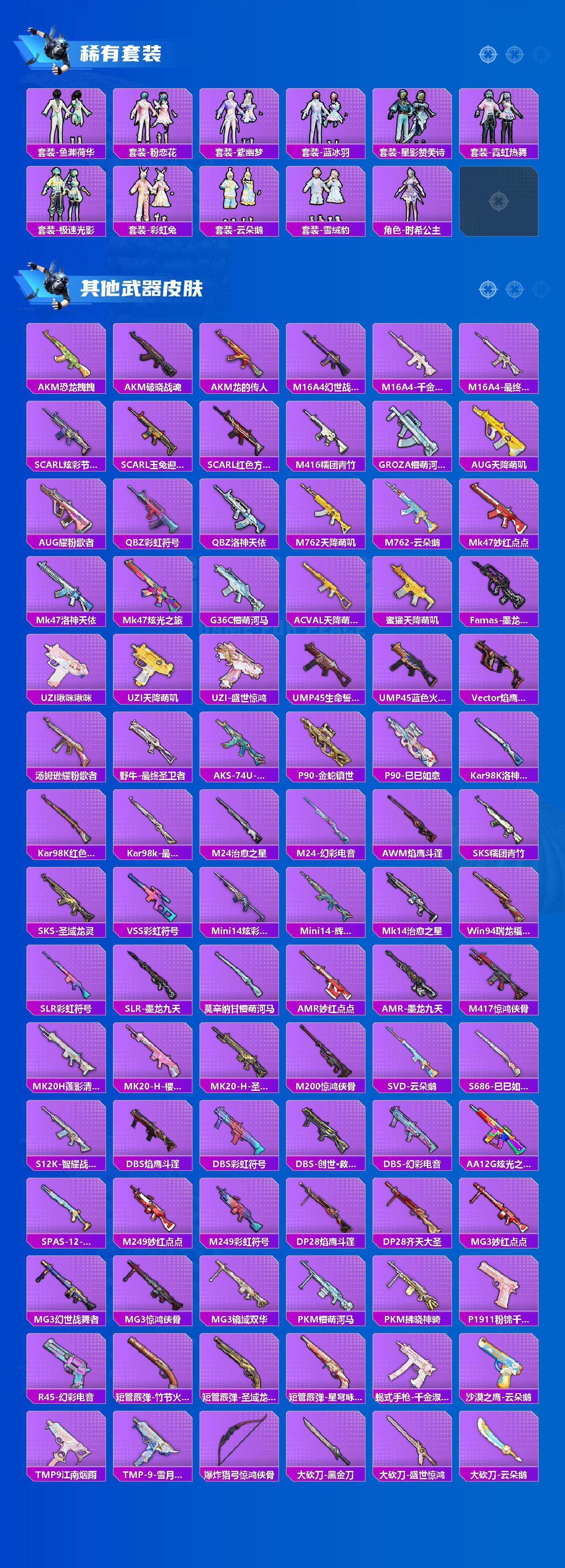 【粉色枪皮】:M416-电玩时刻,GROZA-镜光银凌,AUG-暖羊咩咩,M762-青锋波束,UMP45-量子极限,Vector-最终圣卫者,汤姆逊-热量炸弹,Kar98K-巳巳如意,Kar98K-圣域龙灵,M24-镜域双华,Mk14-甜梦熊击,MK12-雪月幻音,MG3-辉羽雀灵