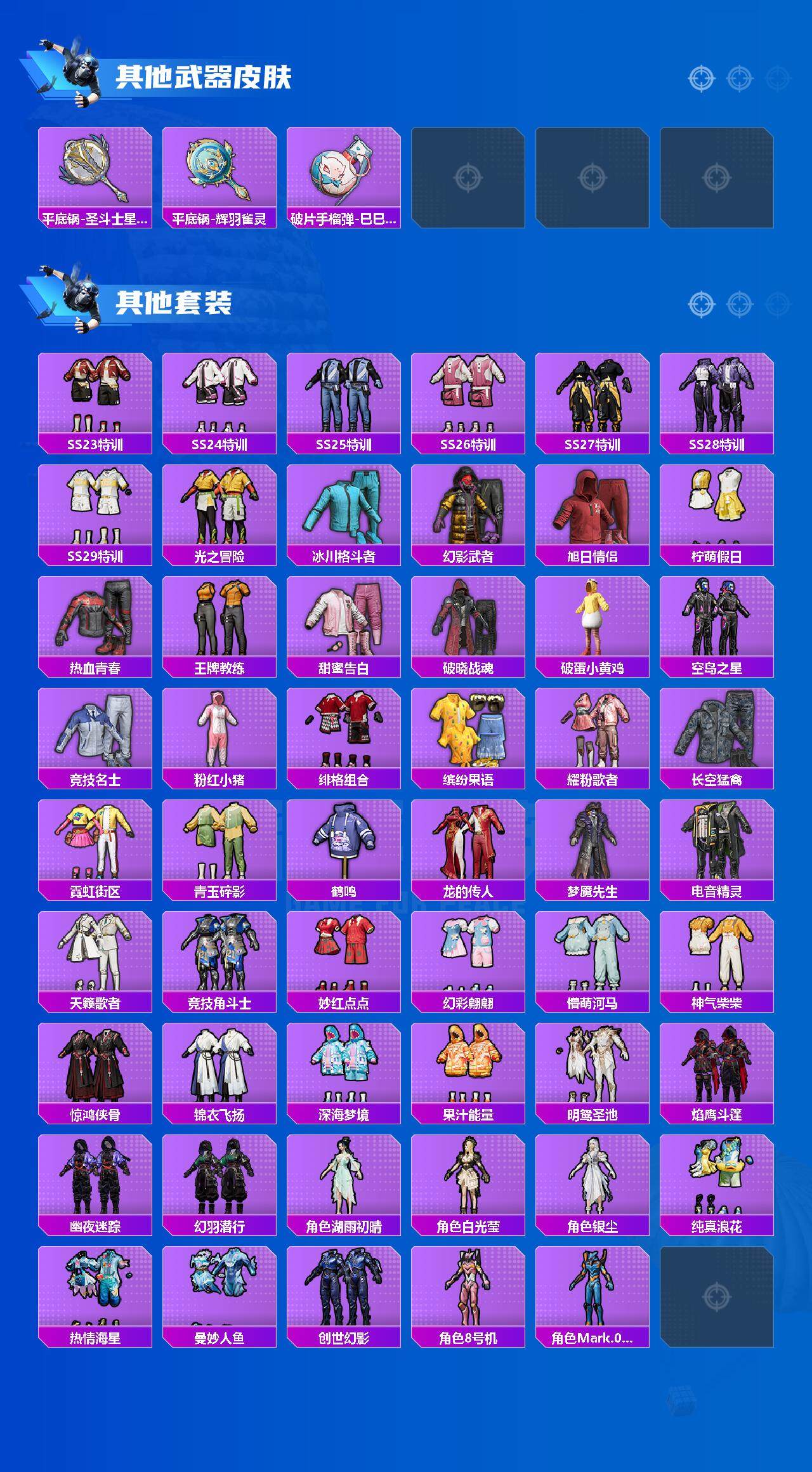 - [11876773]7粉装 4特效枪 2载具 12印记 可二次 可修改实名 优质装备:洛天依,Vector飒粉甜心,七级Vector-飒粉甜心,羊梦糖心,花灵,Kar98K-巳巳如意 热门装扮:旋转彩虹,第五大道,呆萌星弥,白勺歌姬 稀有枪皮:DP-28-豹影疾电 五级特效枪:五级Kar98K-巳巳如意,五级DP-28-豹影疾电 紫色装扮:SS22特训,SS23特训,SS21特训,SS31特训套装,旭日情侣,SS33特训套装,顶瓜瓜,吉莉礼服,电音精灵,酷萌兔限定,长空猛禽,霓虹街区,青年教官,缤纷果语,耀眼新星,蓝色运动,蓝海鲸歌,魅力单车,麻辣教官,黄色名流,黄色运动,黑色伏地魔,龙的传人,龟仙人,冰河战士,龙魂突击队,蝶变,沙漠毒蛇,柠萌假日,橘黑制服,涂山之恋,深蓝色名流,坚韧舞者,破晓战魂,破蛋小黄鸡,空岛之星,红色运动,甜蜜熊情侣,王牌教练,雏菊兔兔,萝兰蝴蝶,SS29特训,米开朗基罗,湖畔霞光,纯真浪花,热情海星,铁血战翼,异域银装,都市丽猫,竞技名士,银尘,惊鸿侠骨,SS24特训(SS24特训套装),SS25特训,锦衣飞扬,湖雨初晴,SS27特训,童真绒兔,华灯初上,SS26特训,春光漫游,快闪甜心,黑夜传说,大橘大利,星渊小夜曲,风华少年志,SS32特训服(SS32特训套装),青玉碎影,绯格组合,光之冒险 优质战备:创世·救赎降落伞,精灵梦叶罗丽降落伞,江南烟雨降落伞,蜜语绒猫降落伞,冷漠罗丽降落伞,炎氏战神飞行翼,炫光之旅降落伞,白勺歌姬降落伞
