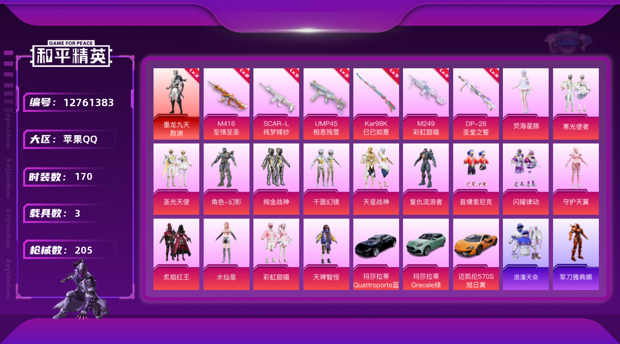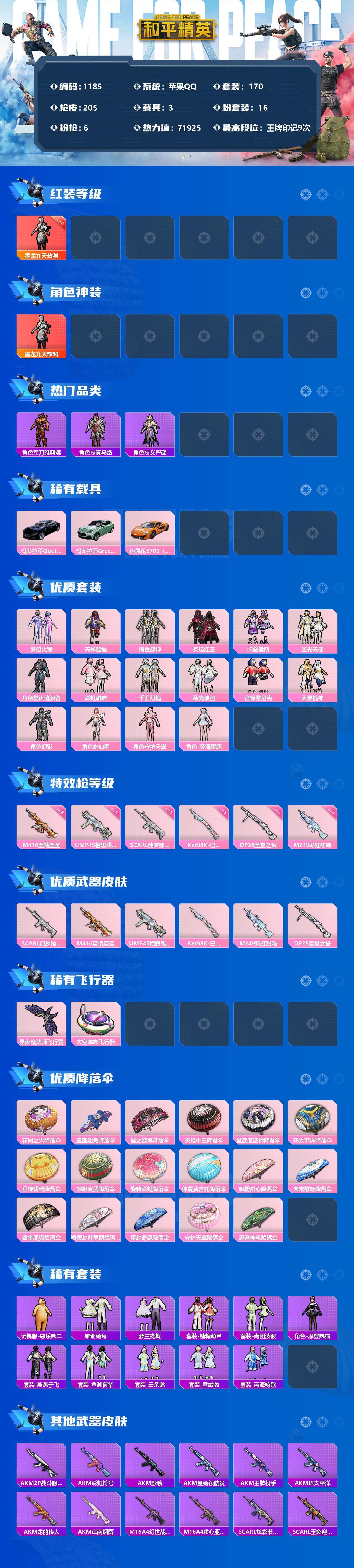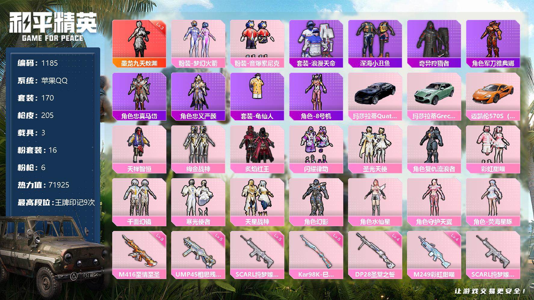[12761383]苹果 手Q-1神装-16粉装-6特效枪-3载具-3粉色飞行器-71925热力值-9王牌印记-170套装-205枪皮