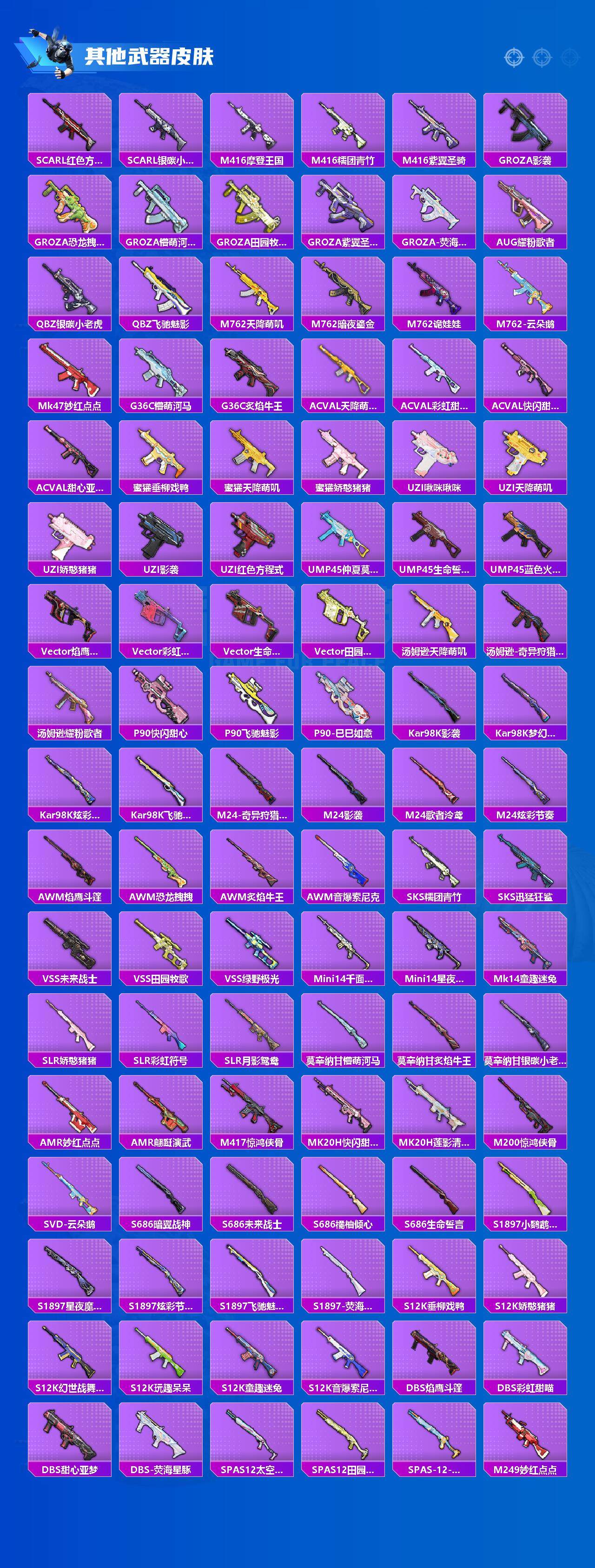 【粉色枪皮等级】:SCAR-L-纯梦嫁纱(五级),M416-至情至圣(八级),UMP45-相思残雪(五级),Kar98K-巳巳如意(五级),M249-彩虹甜喵(四级),DP-28-圣堂之誓(四级)