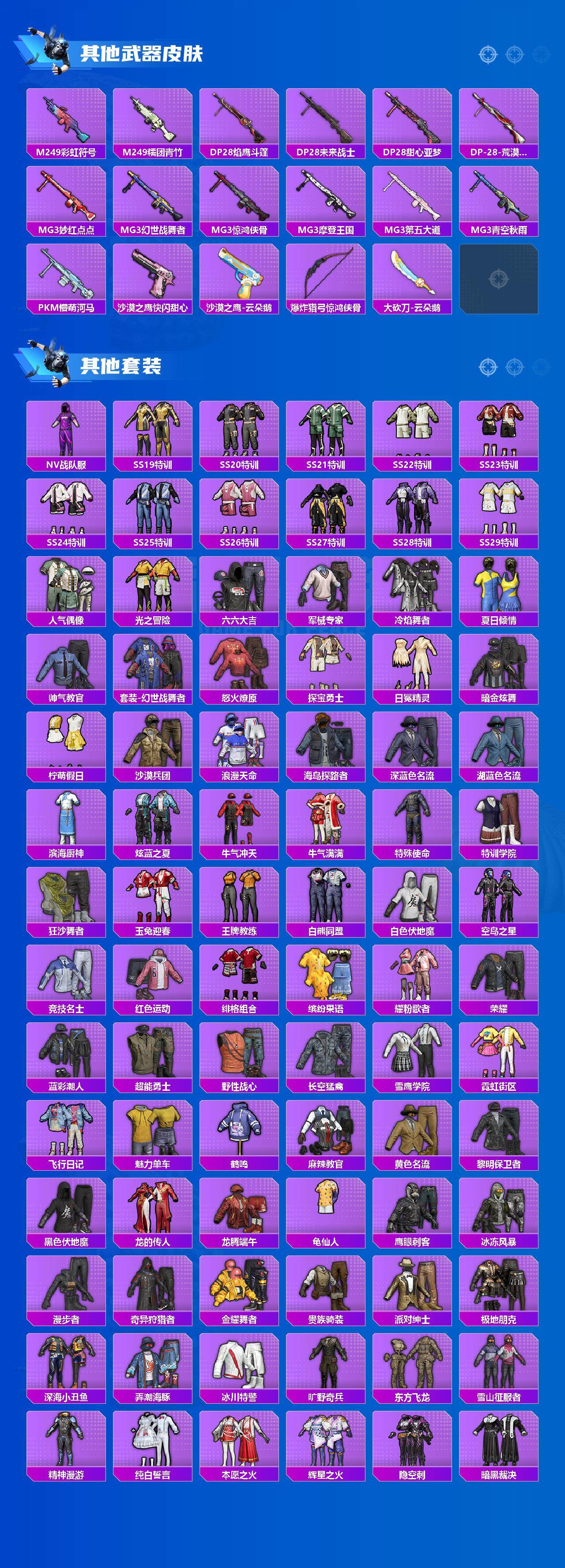 [12761383]苹果 手Q-1神装-16粉装-6特效枪-3载具-3粉色飞行器-71925热力值-9王牌印记-170套装-205枪皮 【红色神装等级】:墨龙九天-敖渊(三级) 【红色角色神装】:墨龙九天-敖渊 【热门品类】:粉装-梦幻火箭,粉装-音爆索尼克,套装-浪漫天命,套装-深海小丑鱼,套装-奇异狩猎者,角色-军刀雅典娜,角色-忠真马岱,角色-忠义严颜,套装-龟仙人,角色-8号机 【粉色载具】:玛莎拉蒂Quattroporte(夜幕蓝),玛莎拉蒂Grecale(薄荷绿),迈凯伦570S(旭日黄) 【粉色套装】:粉装-梦幻火箭,粉装-天禅智恒,粉装-绚金战神,粉装-炙焰红王,粉装-闪耀律动,粉装-圣光天使,角色-复仇流浪者,粉装-彩虹甜喵,粉装-千面幻镜,粉装-寒光使者,粉装-音爆索尼克,粉装-天星战神,角色-幻影,角色-水仙星,角色-守护天翼,角色-荧海星豚 【粉色枪皮等级】:SCAR-L-纯梦嫁纱(五级),M416-至情至圣(八级),UMP45-相思残雪(五级),Kar98K-巳巳如意(五级),M249-彩虹甜喵(四级),DP-28-圣堂之誓(四级) 【粉色枪皮】:SCAR-L-纯梦嫁纱,M416-至情至圣,UMP45-相思残雪,Kar98K-巳巳如意,M249-彩虹甜喵,DP-28-圣堂之誓 【粉色飞行器】:星夜魔法师飞行翼,太空嘟嘟飞行器 【粉色降落伞】:花间之火降落伞,童趣迷兔降落伞,星之彼岸降落伞,炙焰牛王降落伞,星夜魔法师降落伞,环太平洋降落伞,垂柳戏鸭降落伞,翩跹演武降落伞,旋转彩虹降落伞,仲夏莫吉托降落伞,飒粉甜心降落伞,未来歌姬降落伞,鎏金朋克降落伞,精灵梦叶罗丽降落伞,星梦奇缘降落伞,守护天翼降落伞,忍者神龟降落伞 【稀有套装】:套装-龟仙人,玩偶服-憨乐熊二,套装-雏菊兔兔,套装-萝兰蝴蝶,套装-糖糖葫芦,套装-青团波波,角色-摩登魅猫,套装-燕燕于飞,套装-鱼渊荷华,套装-云朵鹅,套装-雪绒豹,套装-蓝海鲸歌 【稀有枪皮】:AKM-2P战斗服款,AKM-彩虹符号,AKM-影袭,AKM-星兔领航员,AKM-江南烟雨,AKM-王牌投手,AKM-环太平洋,AKM-龙的传人,M16A4-幻世战舞者,M16A4-甜心亚梦,SCAR-L-炫彩节奏,SCAR-L-玉兔迎春,SCAR-L-红色方程式,SCAR-L-银碳小老虎,M416-摩登王国,M416-糯团青竹,M4