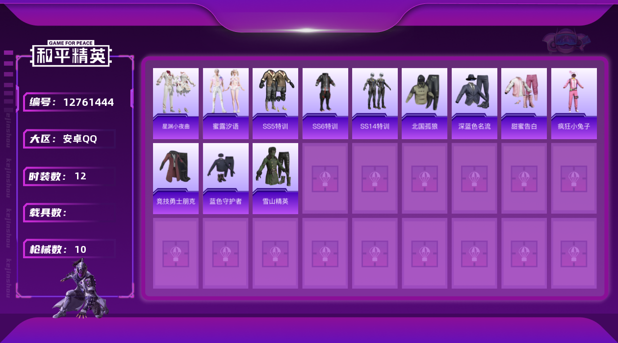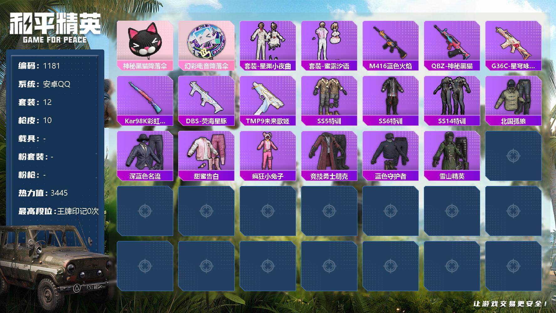 [12761444]安卓 手Q-0粉装-0特效枪-0载具-0粉色飞行器-3445热力值-2王牌印记-12套装-10枪皮