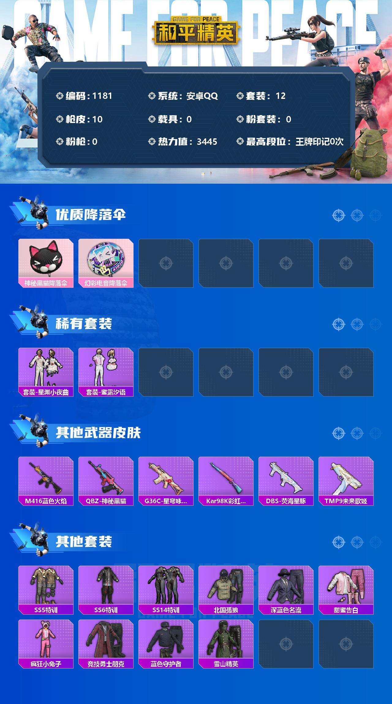 [12761444]安卓 手Q-0粉装-0特效枪-0载具-0粉色飞行器-3445热力值-2王牌印记-12套装-10枪皮 【粉色降落伞】:神秘黑猫降落伞,幻彩电音降落伞 【稀有套装】:套装-星渊小夜曲,套装-蜜露汐语 【稀有枪皮】:M416-蓝色火焰,QBZ-神秘黑猫,G36C-星穹咏叹调,Kar98K-彩虹符号,DBS-荧海星豚,TMP-9-未来歌姬 【其他套装】:套装-SS5特训,套装-SS6特训,套装-SS14特训,套装-北国孤狼,套装-深蓝色名流,套装-甜蜜告白,套装-疯狂小兔子,套装-竞技勇士朋克,套装-蓝色守护者,套装-雪山精英 【营地ID】:922361430