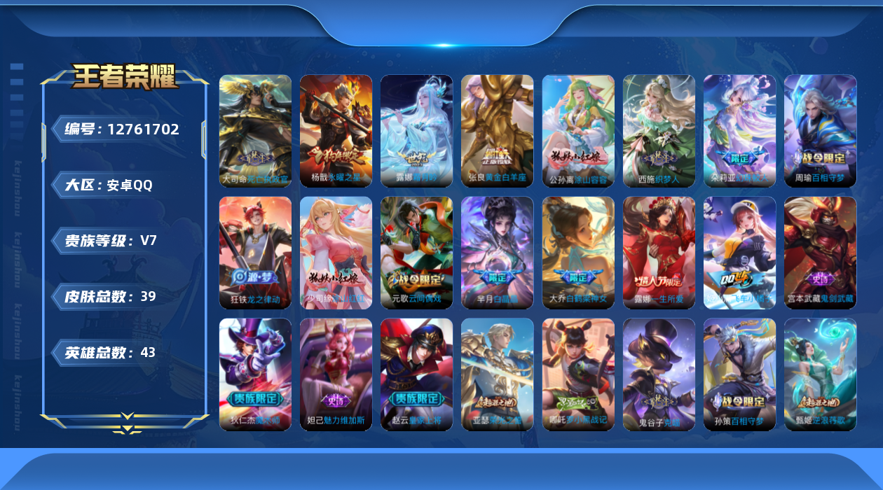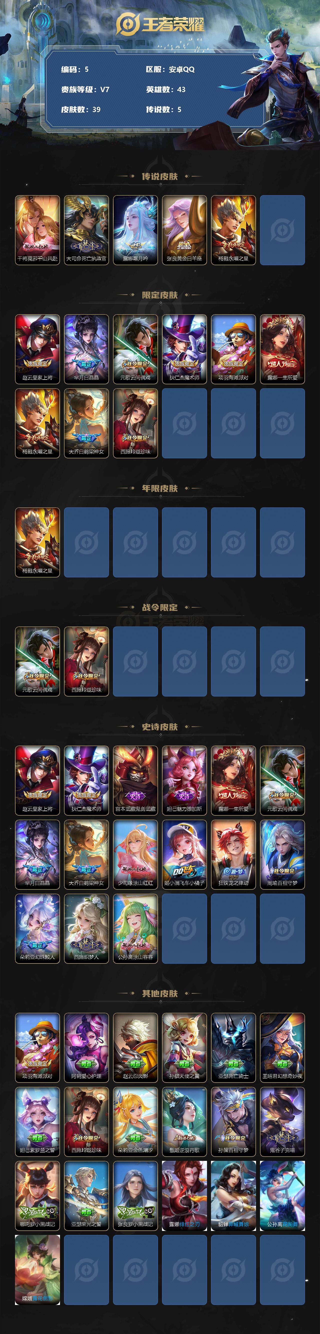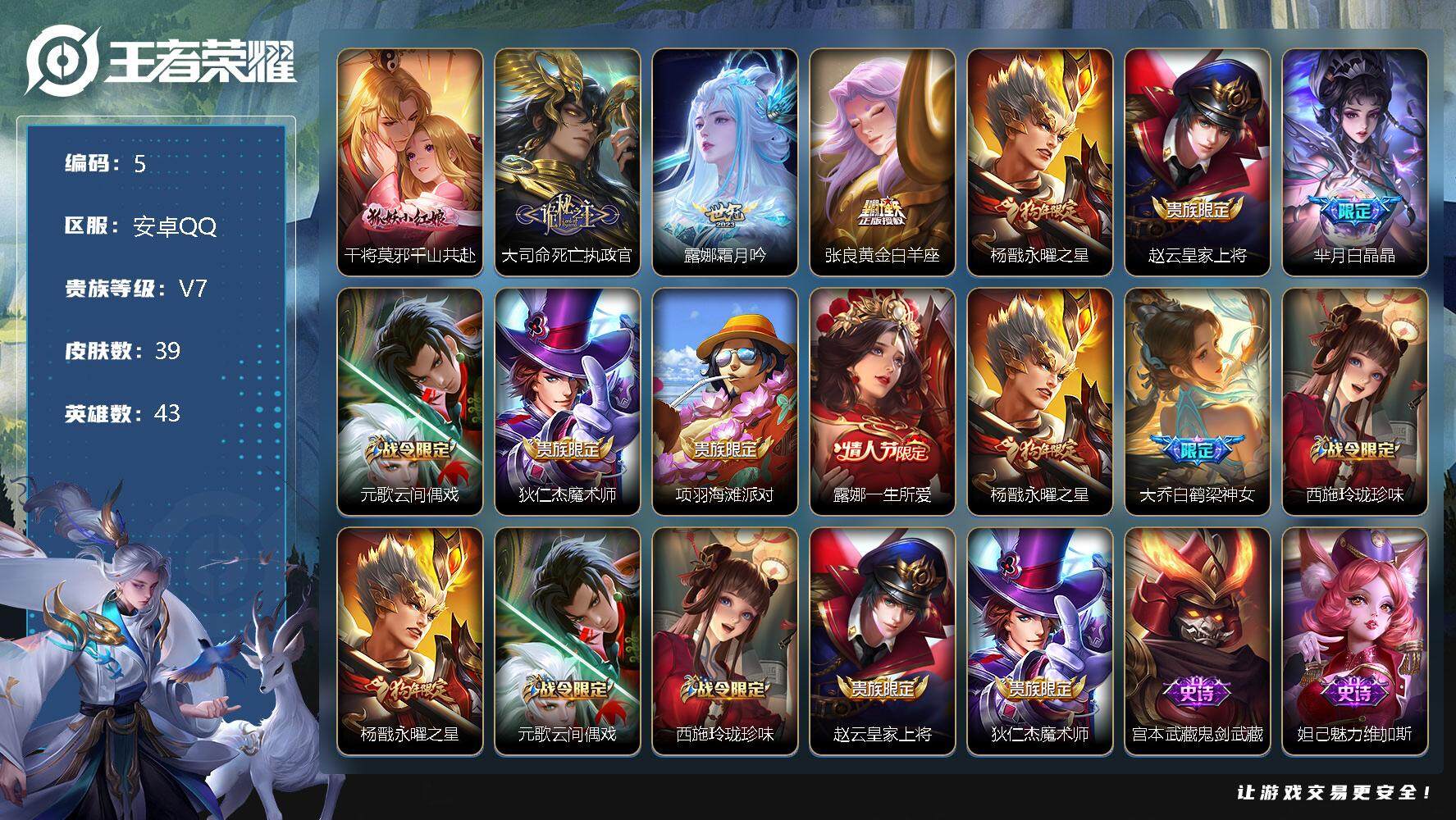 [12761702]安卓Q-V7-最强王者段位-43英雄-39皮肤-0典藏-0珍品无双-0无双-0珍品传说-5传说-15史诗