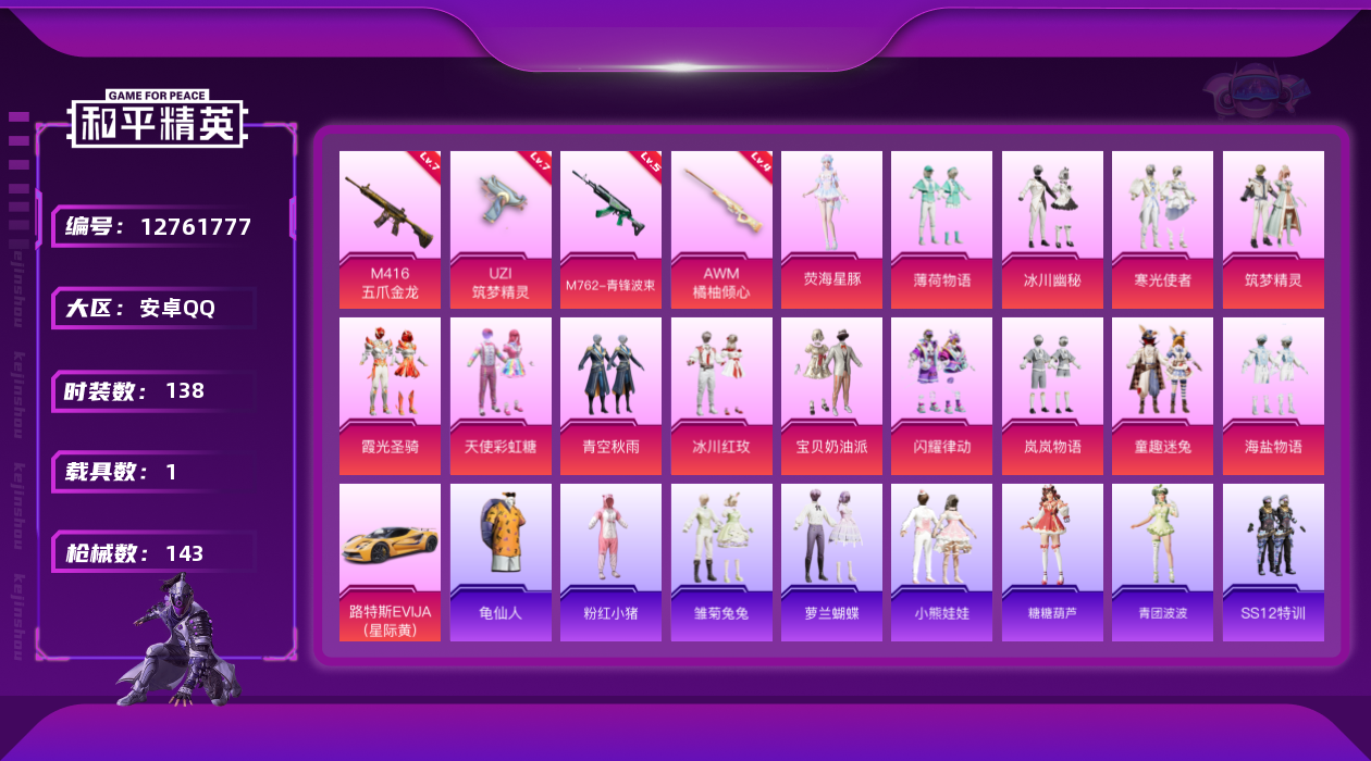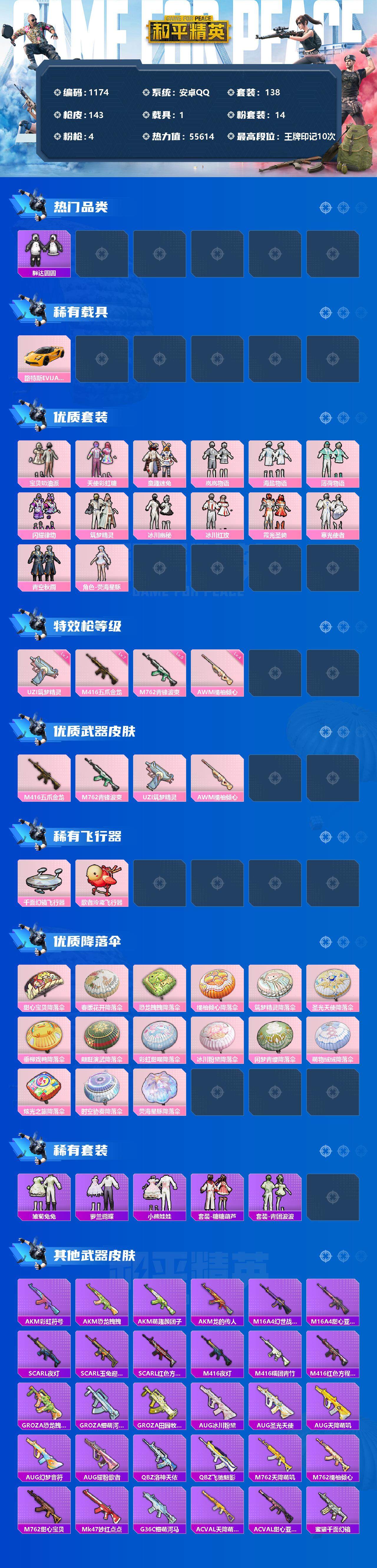 [12761777]安卓 手Q-14粉装-4特效枪-1载具-2粉色飞行器-55614热力值-10王牌印记-138套装-143枪皮 【热门品类】:粉装-童趣迷兔,套装-胖达圆圆,套装-龟仙人,套装-粉红小猪 【粉色载具】:路特斯EVIJA(星际黄) 【粉色套装】:粉装-宝贝奶油派,粉装-天使彩虹糖,粉装-童趣迷兔,粉装-岚岚物语,粉装-海盐物语,粉装-薄荷物语,粉装-闪耀律动,粉装-筑梦精灵,粉装-冰川幽秘,粉装-冰川红玫,粉装-霞光圣骑,粉装-寒光使者,粉装-青空秋雨,角色-荧海星豚 【粉色枪皮等级】:M416-五爪金龙(七级),M762-青锋波束(五级),UZI-筑梦精灵(七级),AWM-橘柚倾心(四级) 【粉色枪皮】:M416-五爪金龙,M762-青锋波束,UZI-筑梦精灵,AWM-橘柚倾心 【粉色飞行器】:千面幻镜飞行器,歌者泠鸢飞行器 【粉色降落伞】:甜心宝贝降落伞,春暖花开降落伞,恐龙拽拽降落伞,橘柚倾心降落伞,筑梦精灵降落伞,圣光天使降落伞,垂柳戏鸭降落伞,翩跹演武降落伞,彩虹甜喵降落伞,冰川粉黛降落伞,闲梦青缨降落伞,萌物绒绒降落伞,炫光之旅降落伞,时空协奏降落伞,荧海星豚降落伞 【稀有套装】:套装-龟仙人,套装-雏菊兔兔,套装-萝兰蝴蝶,套装-小熊娃娃,套装-糖糖葫芦,套装-青团波波 【稀有枪皮】:AKM-彩虹符号,AKM-恐龙拽拽,AKM-萌趣颜团子,AKM-龙的传人,M16A4-幻世战舞者,M16A4-甜心亚梦,SCAR-L-夜灯,SCAR-L-玉兔迎春,SCAR-L-红色方程式,M416-夜灯,M416-糯团青竹,M416-红色方程式,GROZA-恐龙拽拽,GROZA-懵萌河马,GROZA-田园牧歌,AUG-冰川粉黛,AUG-圣光天使,AUG-天降萌叽,AUG-幻梦音符,AUG-耀粉歌者,QBZ-洛神天依,QBZ-飞驰魅影,M762-天降萌叽,M762-橘柚倾心,M762-甜心宝贝,Mk47-妙红点点,G36C-懵萌河马,AC-VAL-天降萌叽,AC-VAL-甜心亚梦,蜜獾-千面幻镜,蜜獾-垂柳戏鸭,蜜獾-天降萌叽,蜜獾-娇憨猪猪,UZI-天降萌叽,UZI-娇憨猪猪,UZI-影袭,UZI-红色方程式,UMP45-春暖花开,UMP45-蓝色火焰,Vector-田园牧歌,汤姆逊-天降萌叽,汤姆逊-炫彩节奏,汤姆逊-耀粉歌者,P90-翩跹演武,P90-飞驰魅影,Kar