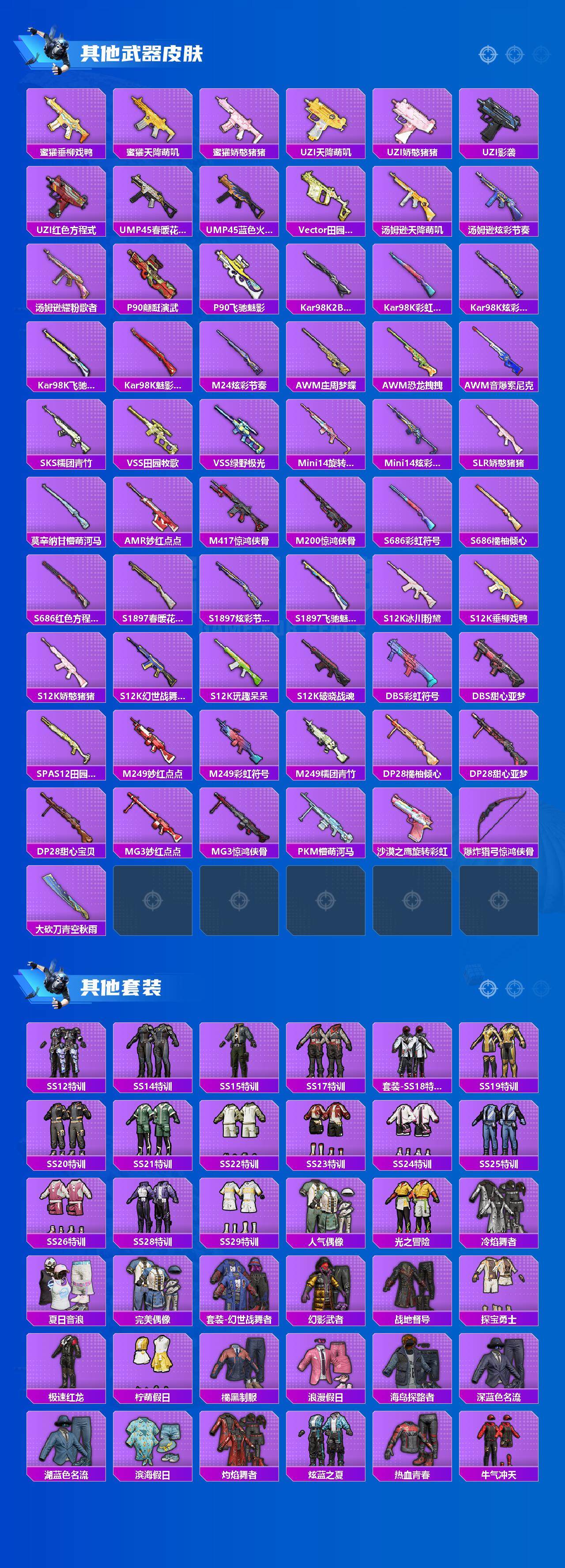 【稀有枪皮】:AKM-彩虹符号,AKM-恐龙拽拽,AKM-萌趣颜团子,AKM-龙的传人,M16A4-幻世战舞者,M16A4-甜心亚梦,SCAR-L-夜灯,SCAR-L-玉兔迎春,SCAR-L-红色方程式,M416-夜灯,M416-糯团青竹,M416-红色方程式,GROZA-恐龙拽拽,GROZA-懵萌河马,GROZA-田园牧歌,AUG-冰川粉黛,AUG-圣光天使,AUG-天降萌叽,AUG-幻梦音符,AUG-耀粉歌者,QBZ-洛神天依,QBZ-飞驰魅影,M762-天降萌叽,M762-橘柚倾心,M762-甜心宝贝,Mk47-妙红点点,G36C-懵萌河马,AC-VAL-天降萌叽,AC-VAL-甜心亚梦,蜜獾-千面幻镜,蜜獾-垂柳戏鸭,蜜獾-天降萌叽,蜜獾-娇憨猪猪,UZI-天降萌叽,UZI-娇憨猪猪,UZI-影袭,UZI-红色方程式,UMP45-春暖花开,UMP45-蓝色火焰,Vector-田园牧歌,汤姆逊-天降萌叽,汤姆逊-炫彩节奏,汤姆逊-耀粉歌者,P90-翩跹演武,P90-飞驰魅影,Kar