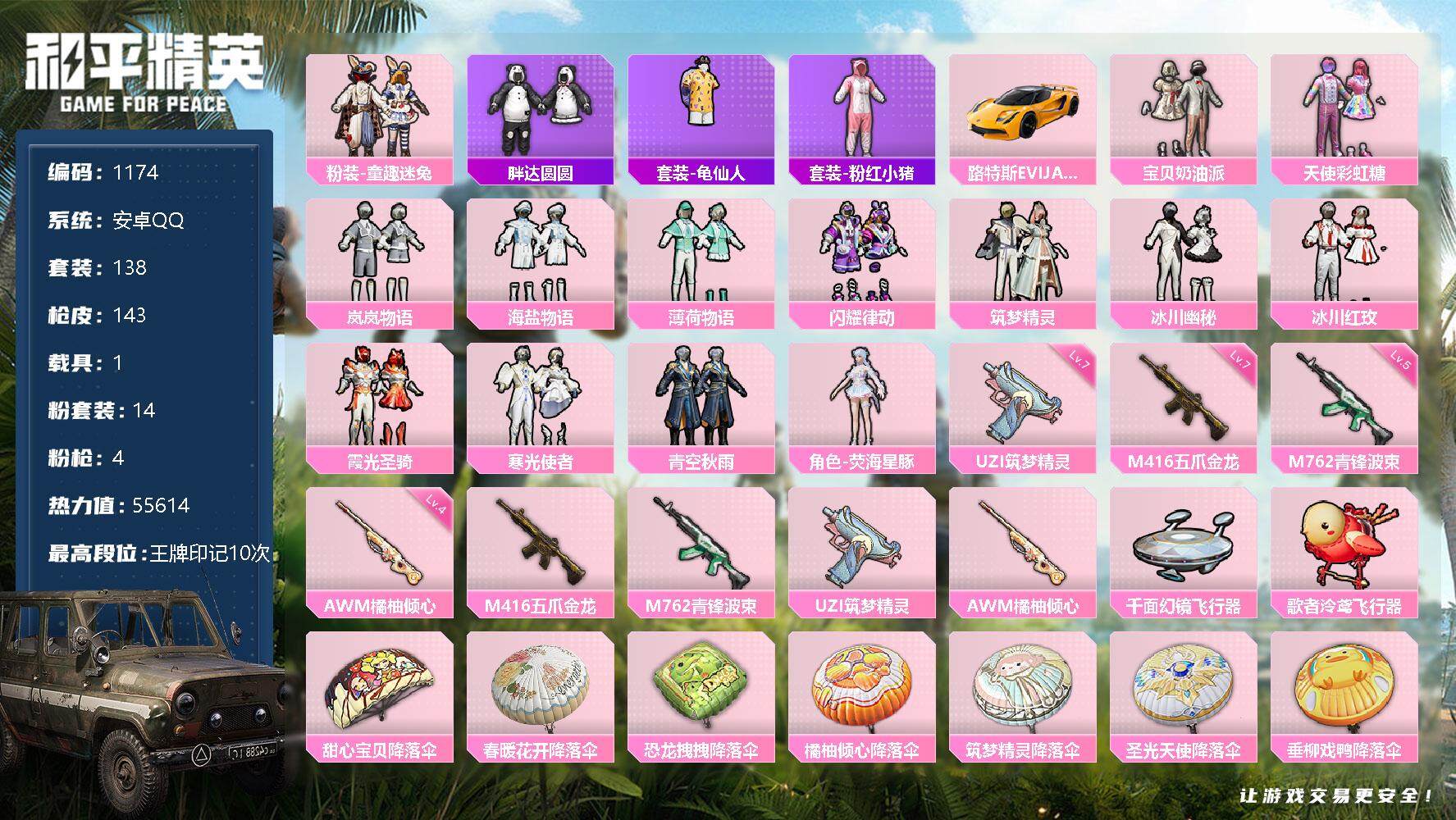 [12761777]安卓 手Q-14粉装-4特效枪-1载具-2粉色飞行器-55614热力值-10王牌印记-138套装-143枪皮