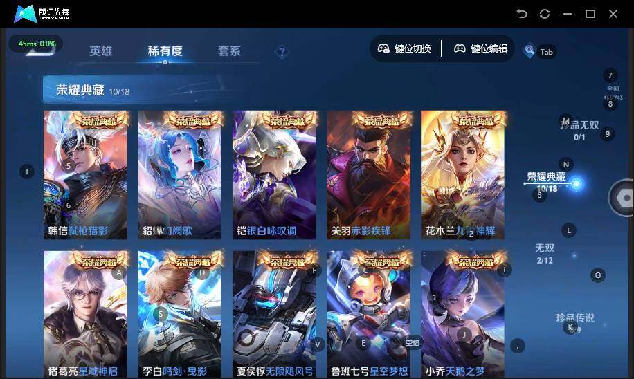 【荣耀典藏】:武则天英雄,夏侯惇无限飓风号,小乔天鹅之梦,鲁班七号星空梦想,李白鸣剑曳影,诸葛亮星域神启,花木兰九霄神辉,关羽赤影疾锋,铠银白咏叹调,貂蝉幻阙歌,韩信弑枪猎影