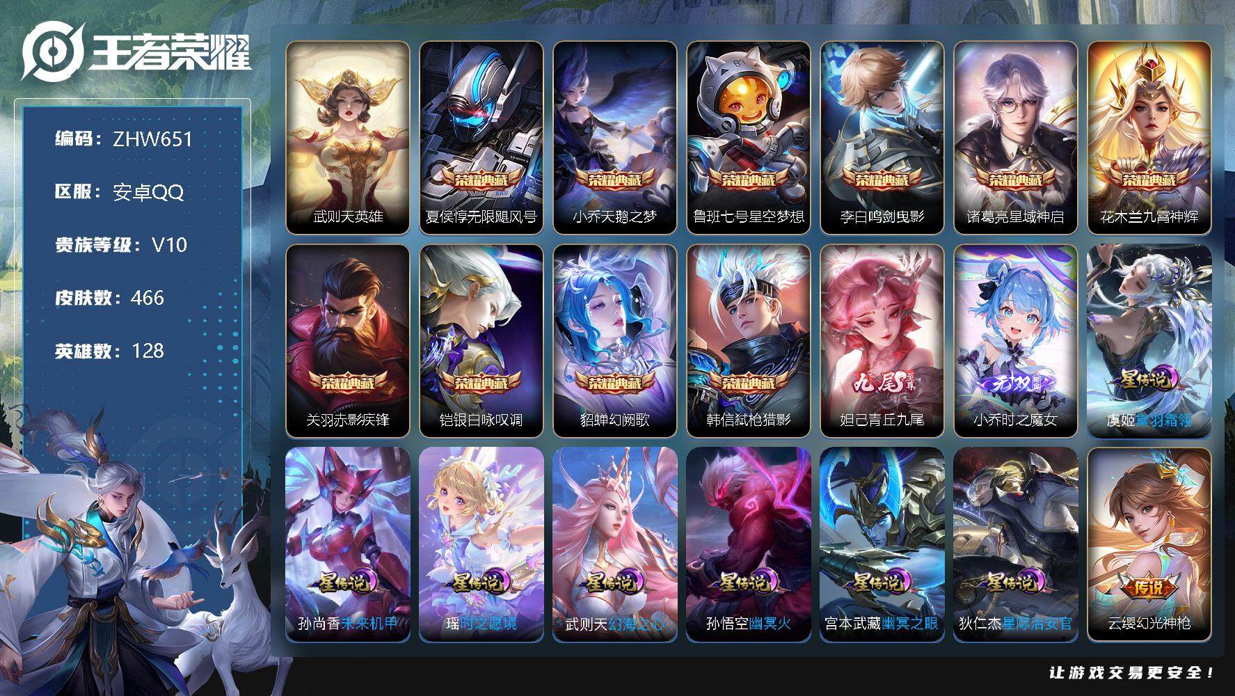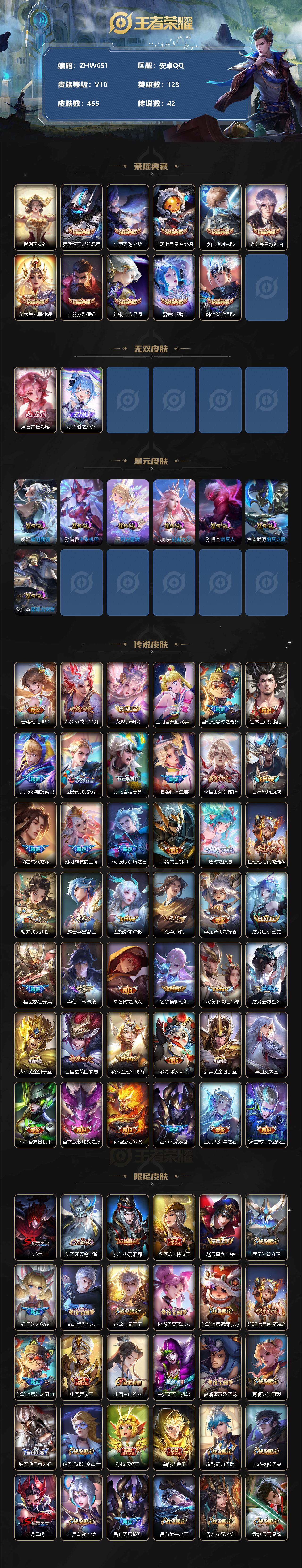 [12761943]【特价急出/详情看图】:安卓Q-V10-至尊星耀II段位-128英雄-466皮肤-10典藏-2无双-7星元-42传说-143史诗