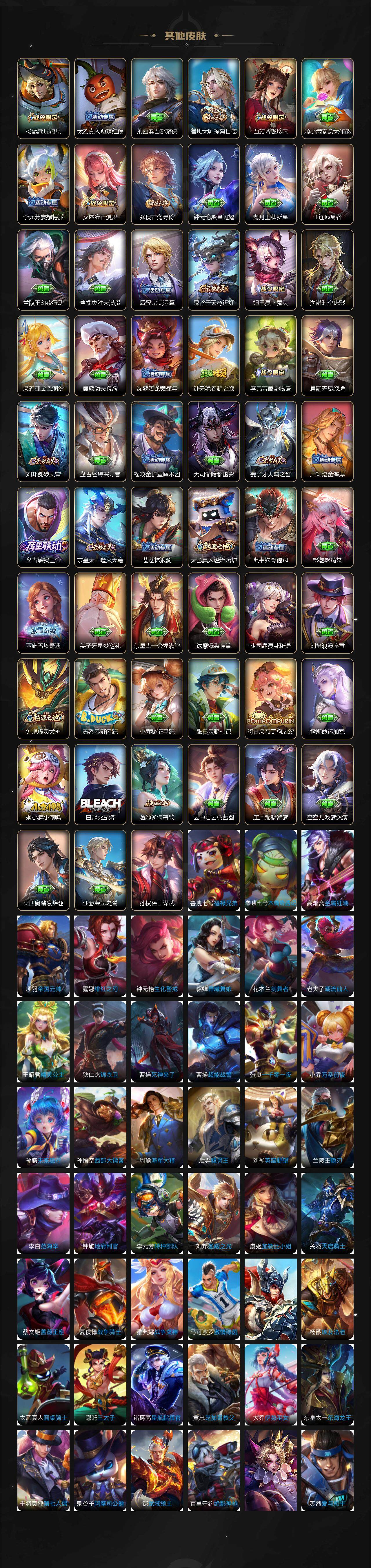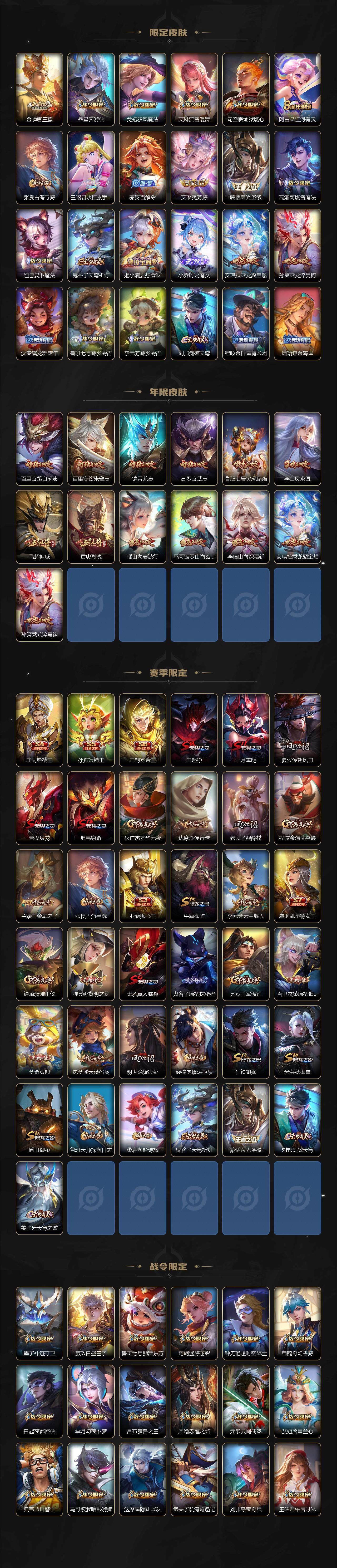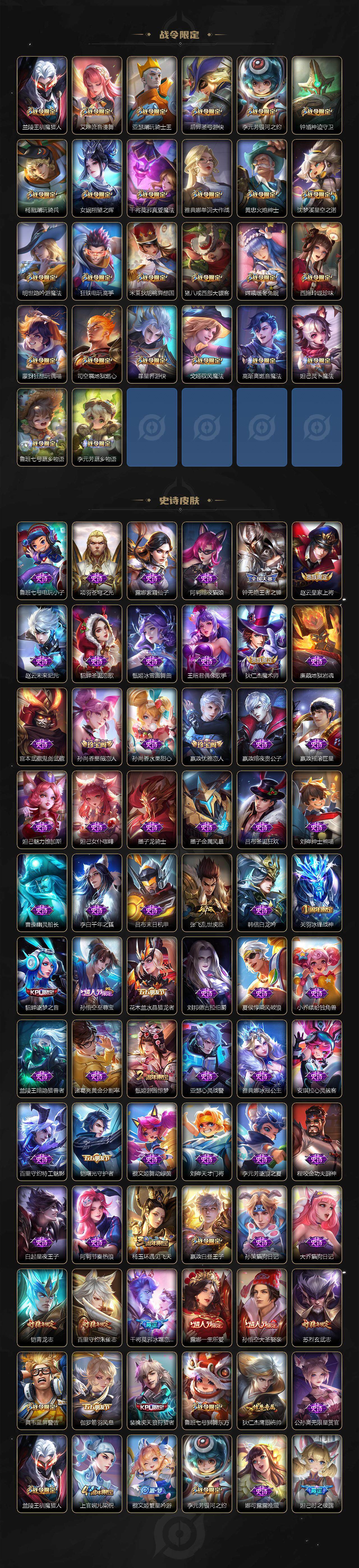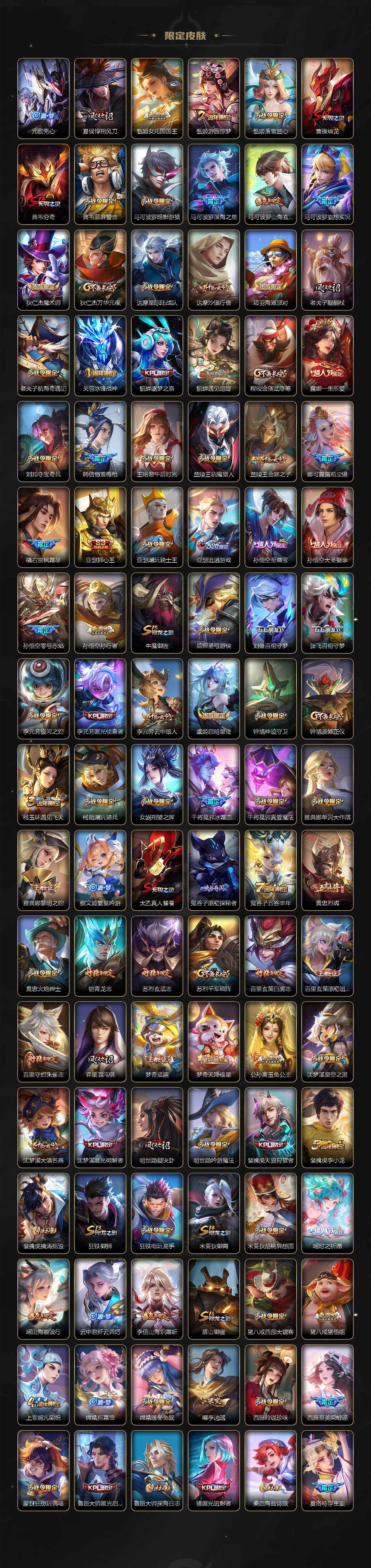 【限定皮肤】:白起狰,姜子牙天穹之誓,狄仁杰阴阳师,虞姬凯尔特女王,赵云皇家上将,墨子神迹守卫,妲己时之彼端,嬴政优雅恋人,嬴政白昼王子,孙尚香蔷薇恋人,鲁班七号狮舞东方,鲁班七号寅虎瑞焰,鲁班七号时之奇旅,庄周蜃楼王,庄周高山流水,高渐离死亡摇滚,高渐离玩趣恶龙,阿轲迷踪丽影,钟无艳王者之锤,钟无艳超时空战士,孙膑妖精王,扁鹊炼金王,扁鹊奇幻香踪,白起夜都怪侠,芈月重明,芈月幻夜卜梦,吕布天魔缭乱,吕布猎兽之王,周瑜赤莲之焰,元歌云间偶戏,元歌无心,夏侯惇朔风刀,甄姬女儿国国王,甄姬游园惊梦,甄姬落雪兰心,曹操烛龙,典韦穷奇,典韦蓝屏警告,马可波罗暗影游猎,马可波罗深海之息,马可波罗山海玄木吟,马可波罗妄想实况,狄仁杰魔术师,狄仁杰万华元夜,达摩星际陆战队,达摩沙漠行僧,项羽海滩派对,老夫子醍醐杖,老夫子航海奇遇记,关羽冰锋战神,貂蝉逐梦之音,貂蝉遇见胡旋,程咬金演