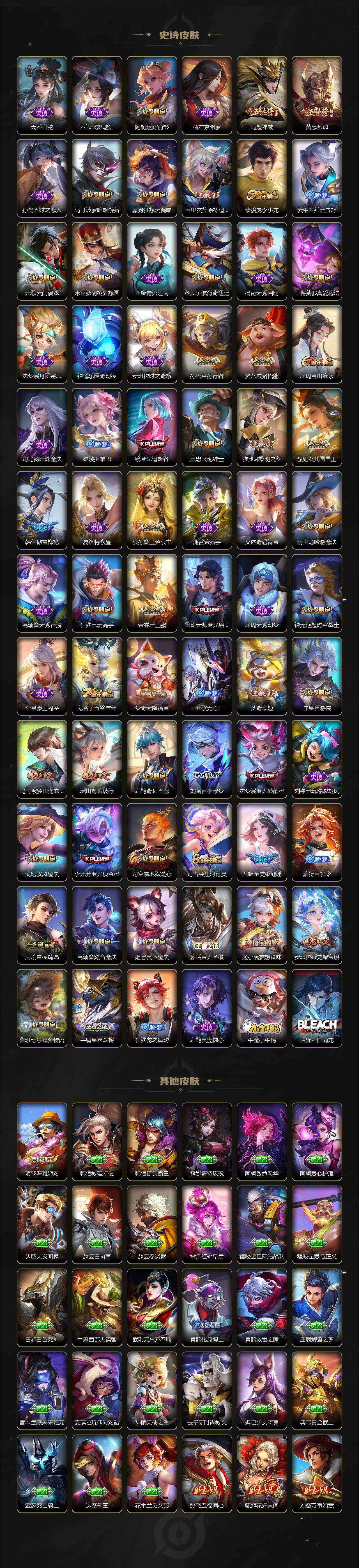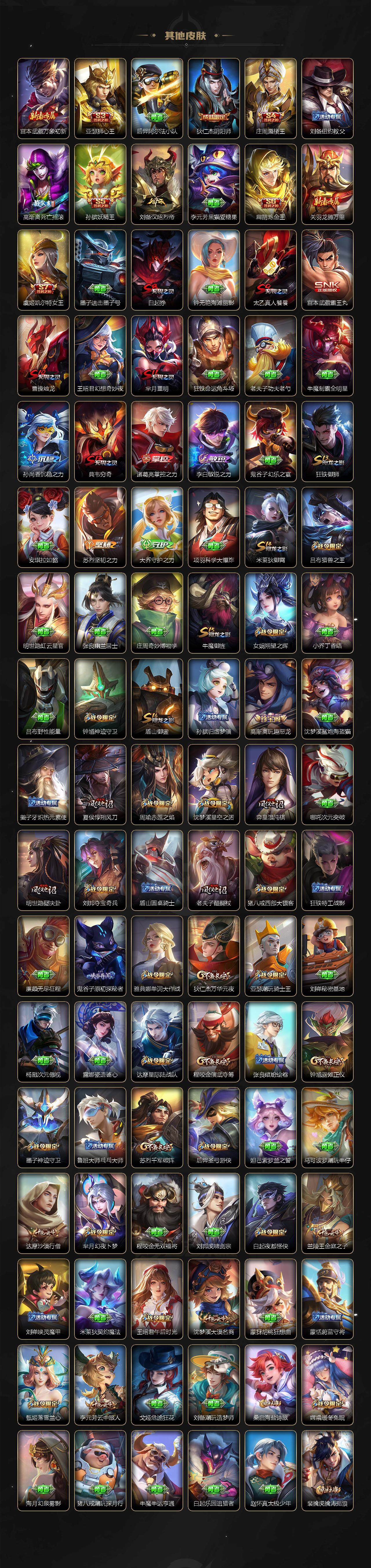 亚瑟狮心王,庄周蜃楼王,孙膑妖精王,扁鹊炼金王,虞姬凯尔特女王,白起狰,太乙真人饕餮,曹操烛龙,芈月重明,典韦穷奇,狂铁御狮,米莱狄御霄,牛魔御旌,盾山御銮,夏侯惇朔风刀,明世隐疑决卦,老夫子醍醐杖,鬼谷子原初探秘者,狄仁杰万华元夜,程咬金演武夺筹,钟馗驱傩正仪,苏烈千军破阵,吕布猎兽之王,嬴政白昼王子,女娲朔望之晖,典韦蓝屏警告,钟馗神迹守卫,鲁班七号狮舞东方,沈梦溪星空之诺,李元芳银河之约,刘邦夺宝奇兵,马可波罗暗影游猎,蒙犽狂想玩偶喵,元歌云间偶戏,弈星混沌棋,达摩沙漠行僧,兰陵王金庭之子,沈梦溪大漠名商,李元芳云中旅人,桑启海盐诗旅,裴擒虎擒涛扼浪,鲁班大师探海日志,张良古海寻踪