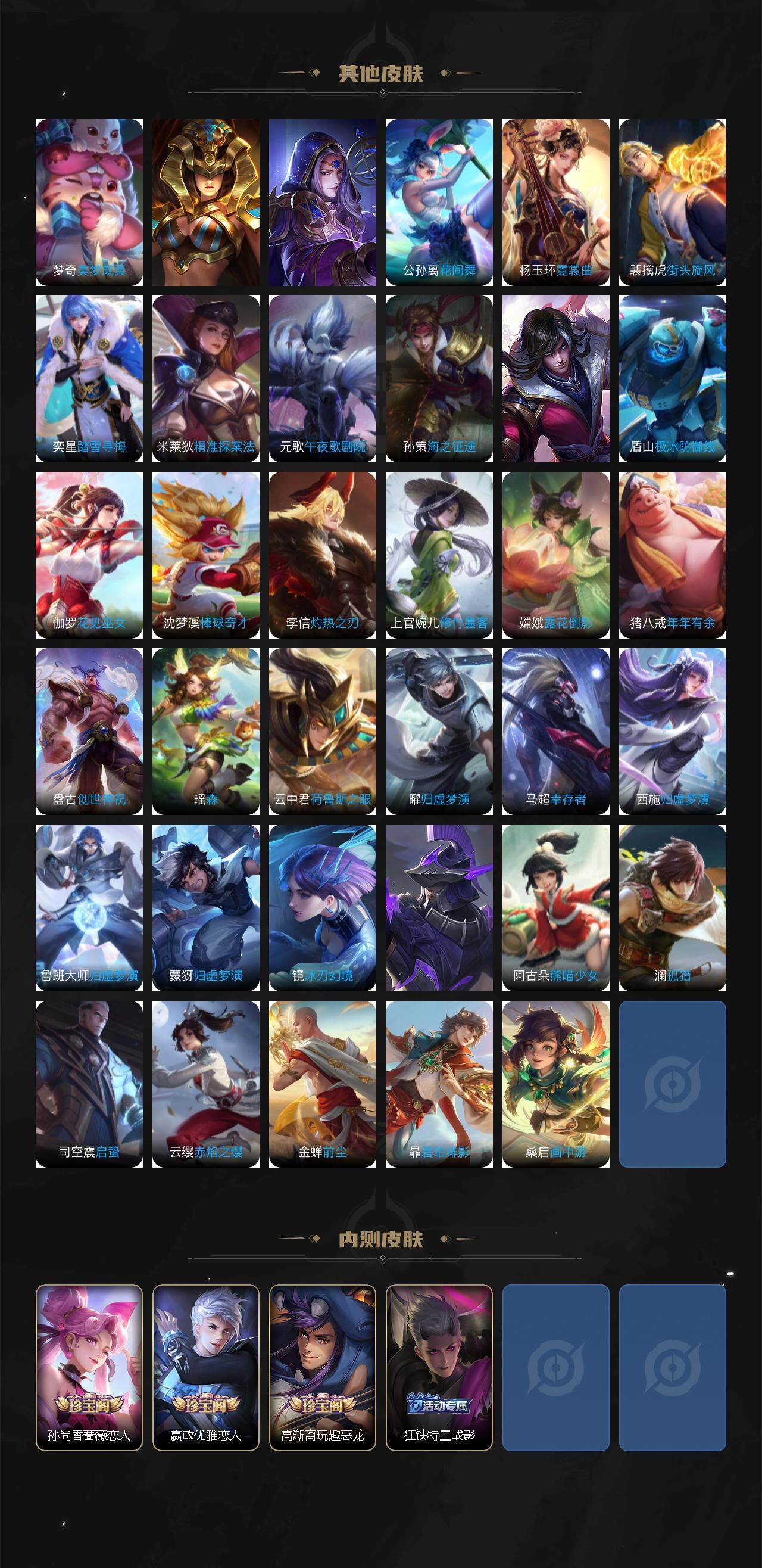 关羽冰锋战神,裴擒虎李小龙,上官婉儿梁祝,貂蝉逐梦之音,黄忠烈魂,马超神威,裴擒虎天狼狩猎者,铠青龙志,百里玄策白虎志,苏烈玄武志,百里守约朱雀志,孙悟空大圣娶亲,露娜一生所爱,孙悟空至尊宝,干将莫邪冰霜恋舞曲,妲己时之彼端,猪八戒猪悟能,孙悟空孙行者,甄姬女儿国国王,镜匿光追影者,韩信傲雪梅枪,鲁班七号寅虎·瑞焰,瑶时之祈愿,公孙离玉兔公主,马可波罗深海之息,金蝉唐三藏,娜可露露前尘镜,橘右京枫霜尽,鲁班大师匿光启智者,马可波罗山海·玄木吟,瑶山海·碧波行,西施至美·乘鲤谣