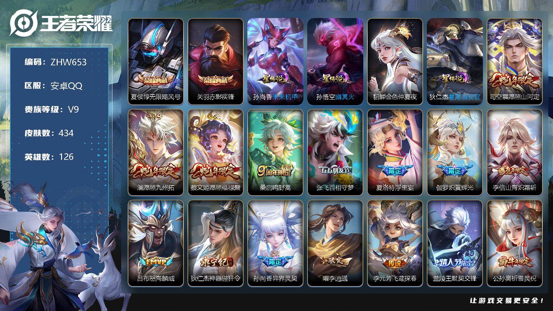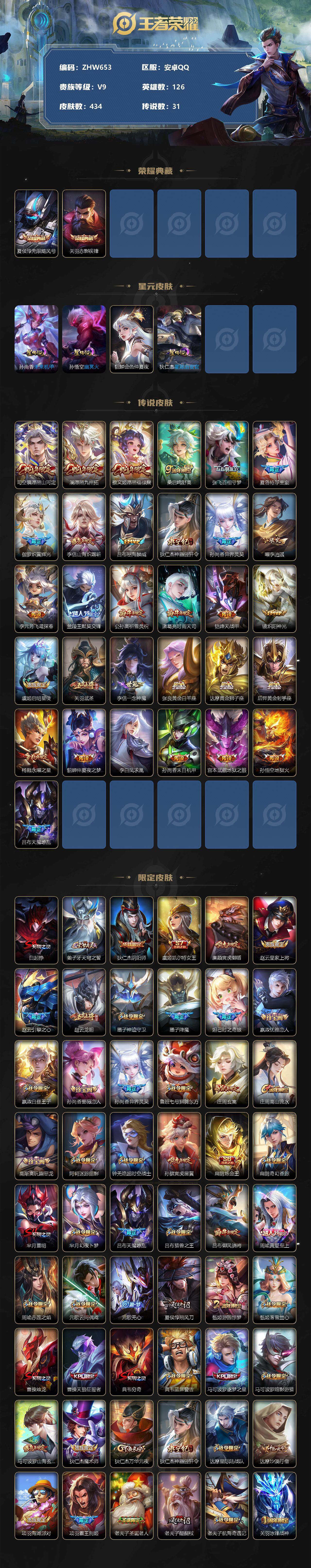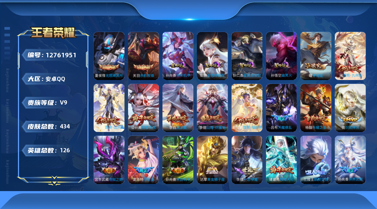 [12761951]【特价急出/详情看图】:安卓Q-V9-最强王者段位-126英雄-434皮肤-2典藏-4星元-31传说-141史诗