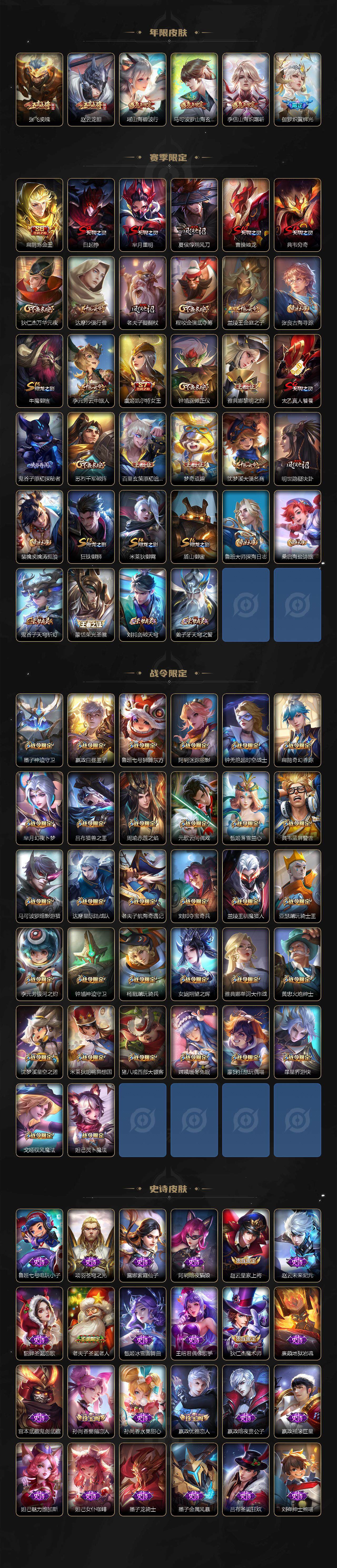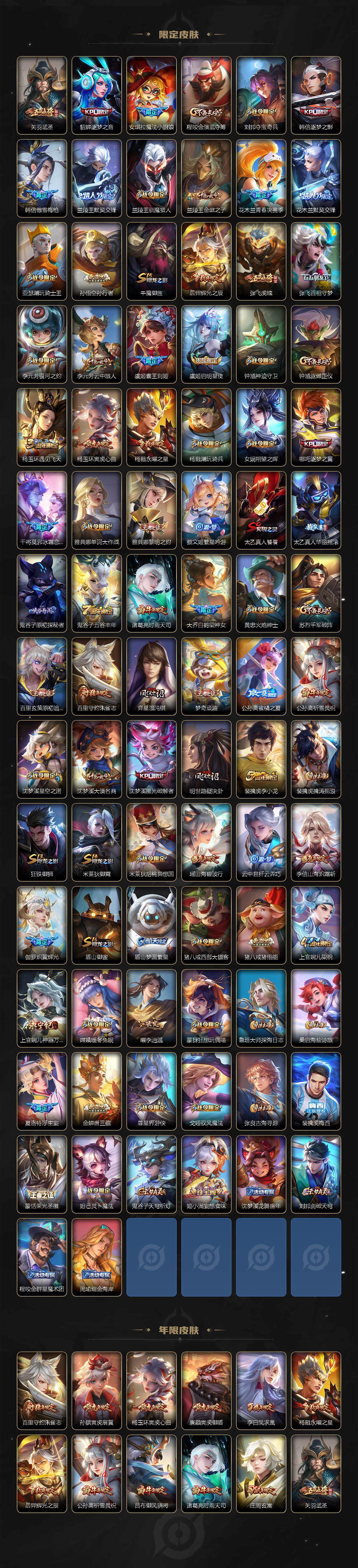 【限定皮肤】:白起狰,姜子牙天穹之誓,狄仁杰阴阳师,虞姬凯尔特女王,廉颇寅虎御盾,赵云皇家上将,赵云引擎之心,赵云龙胆,墨子神迹守卫,墨子降魔,妲己时之奇旅,嬴政优雅恋人,嬴政白昼王子,孙尚香蔷薇恋人,孙尚香异界灵契,鲁班七号狮舞东方,庄周玄嵩,庄周高山流水,高渐离玩趣恶龙,阿轲迷踪丽影,钟无艳超时空战士,孙膑寅虎展翼,扁鹊炼金王,扁鹊奇幻香踪,芈月重明,芈月幻夜卜梦,吕布天魔缭乱,吕布猎兽之王,吕布御风骁将,周瑜真爱至上,周瑜赤莲之焰,元歌云间偶戏,元歌无心,夏侯惇朔风刀,甄姬游园惊梦,甄姬落雪兰心,曹操烛龙,曹操天狼征服者,典韦穷奇,典韦蓝屏警告,马可波罗逐梦之星,马可波罗暗影游猎,马可波罗山海玄木吟,狄仁杰魔术师,狄仁杰万华元夜,狄仁杰神器狴犴令,达摩星际陆战队,达摩沙漠行僧,项羽海滩派对,项羽霸王别姬,老夫子圣诞老人,老夫子醍醐杖,老夫子航海奇遇记,关羽冰锋战神,关羽武圣,貂蝉逐梦之音,安琪拉魔法小厨娘,程咬金演武夺筹,刘邦夺宝奇兵,韩信逐梦之影,韩信傲雪梅枪,兰陵王默契交锋,兰陵王驯魔猎人,兰陵王金庭之子,花木兰青春决赛季,花木兰默契交锋,亚瑟潮玩骑士王,孙悟空孙行者,牛魔御旌,后羿辉光之辰,张飞虎魄,张飞百相守梦,李元芳银河之约,李元芳云中旅人,虞姬霸王别姬,虞姬启明星使,钟馗神迹守卫,钟馗驱傩正仪,杨玉环遇见飞天,杨玉环寅虎心曲,杨戬永曜之星,杨戬潮玩骑兵,女娲朔望之晖,哪吒逐