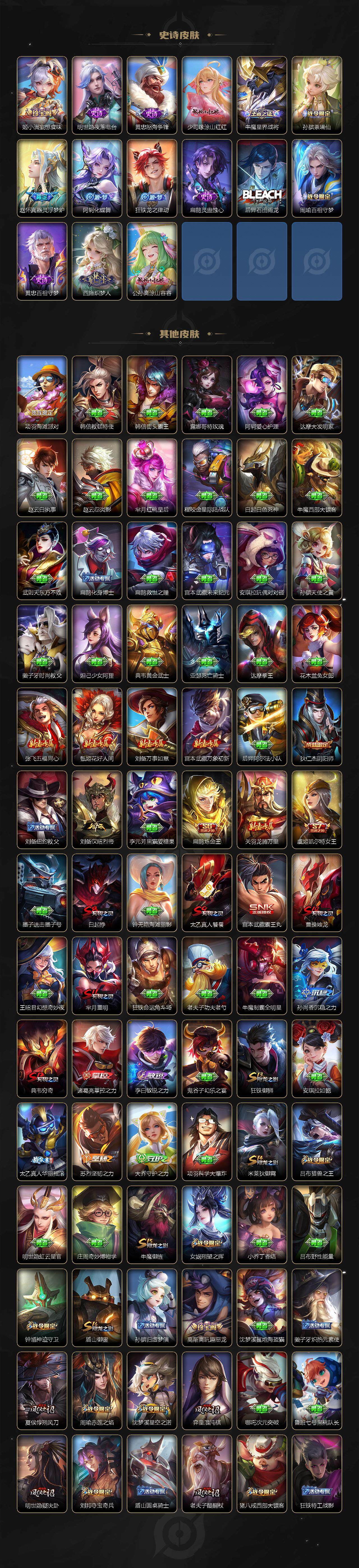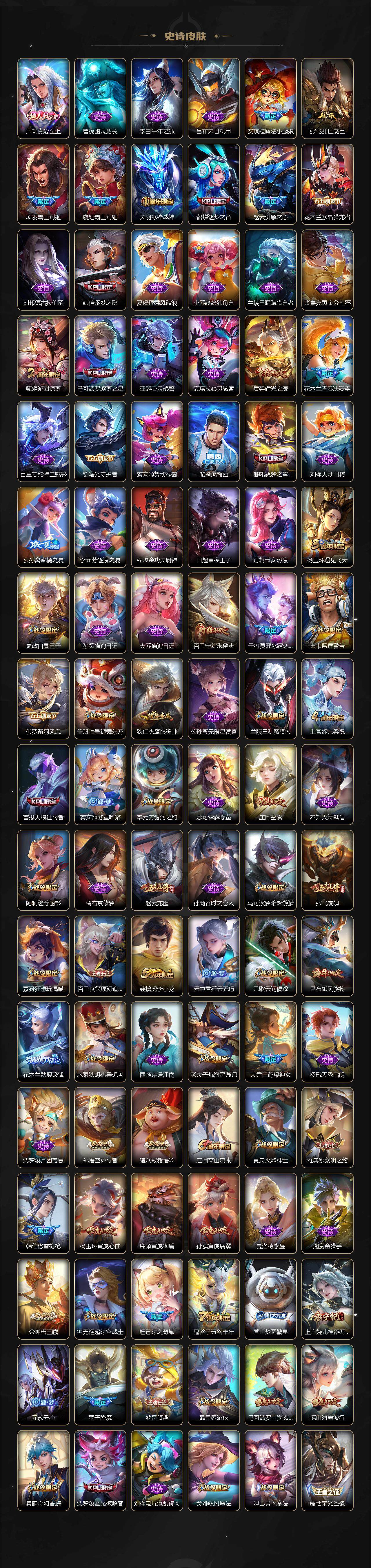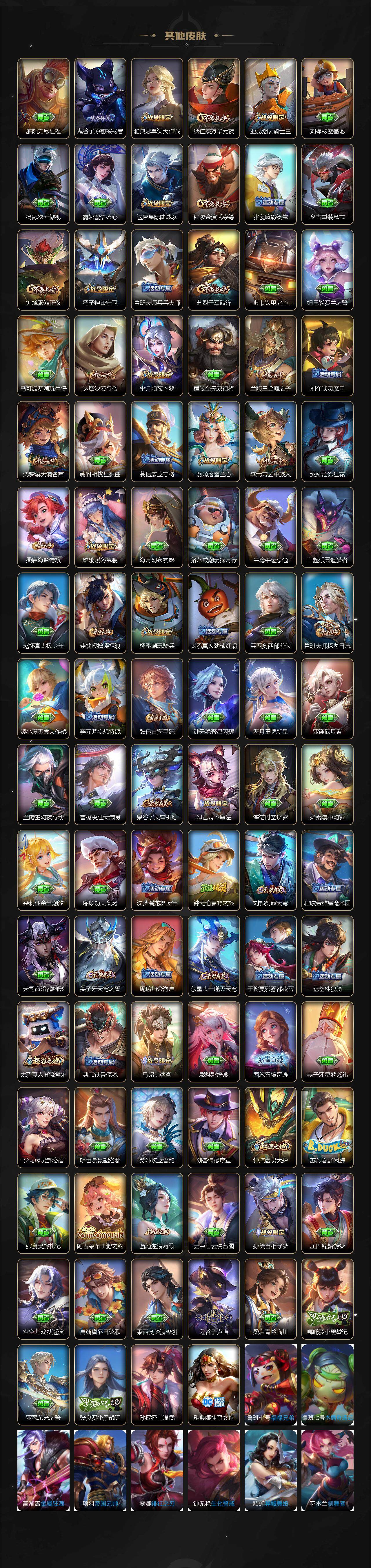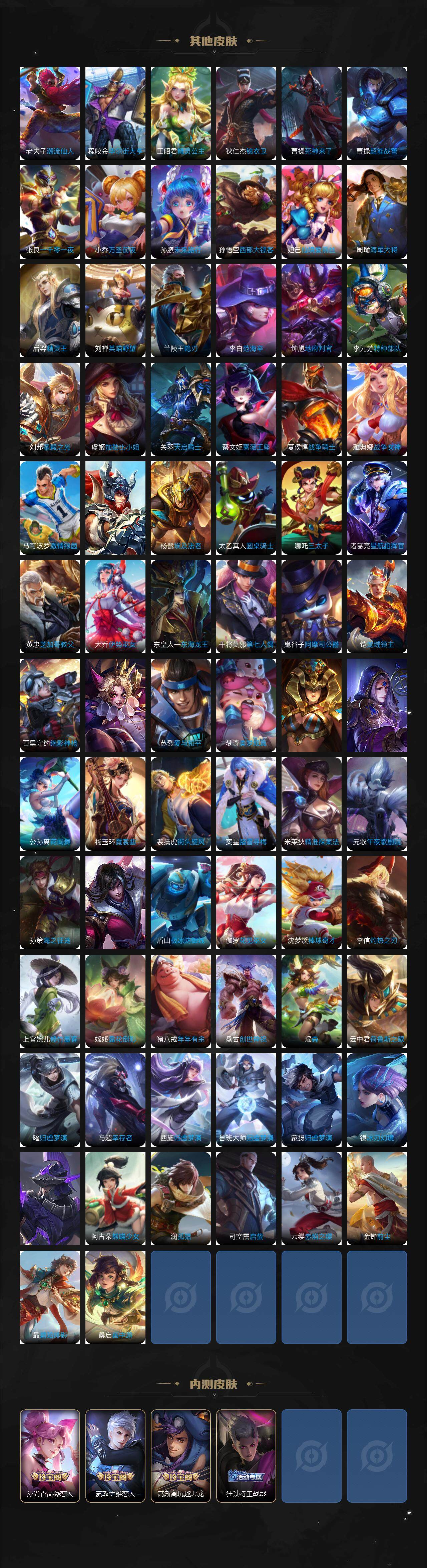 扁鹊炼金王,虞姬凯尔特女王,白起狰,太乙真人饕餮,曹操烛龙,芈月重明,典韦穷奇,狂铁御狮,米莱狄御霄,牛魔御旌,盾山御銮,夏侯惇朔风刀,明世隐疑决卦,老夫子醍醐杖,鬼谷子原初探秘者,狄仁杰万华元夜,程咬金演武夺筹,钟馗驱傩正仪,苏烈千军破阵,吕布猎兽之王,嬴政白昼王子,女娲朔望之晖,典韦蓝屏警告,钟馗神迹守卫,鲁班七号狮舞东方,沈梦溪星空之诺,李元芳银河之约,刘邦夺宝奇兵,马可波罗暗影游猎,蒙犽狂想玩偶喵,元歌云间偶戏,弈星混沌棋,达摩沙漠行僧,兰陵王金庭之子,沈梦溪大漠名商,李元芳云中旅人,桑启海盐诗旅,裴擒虎擒涛扼浪,鲁班大师探海日志,张良古海寻踪