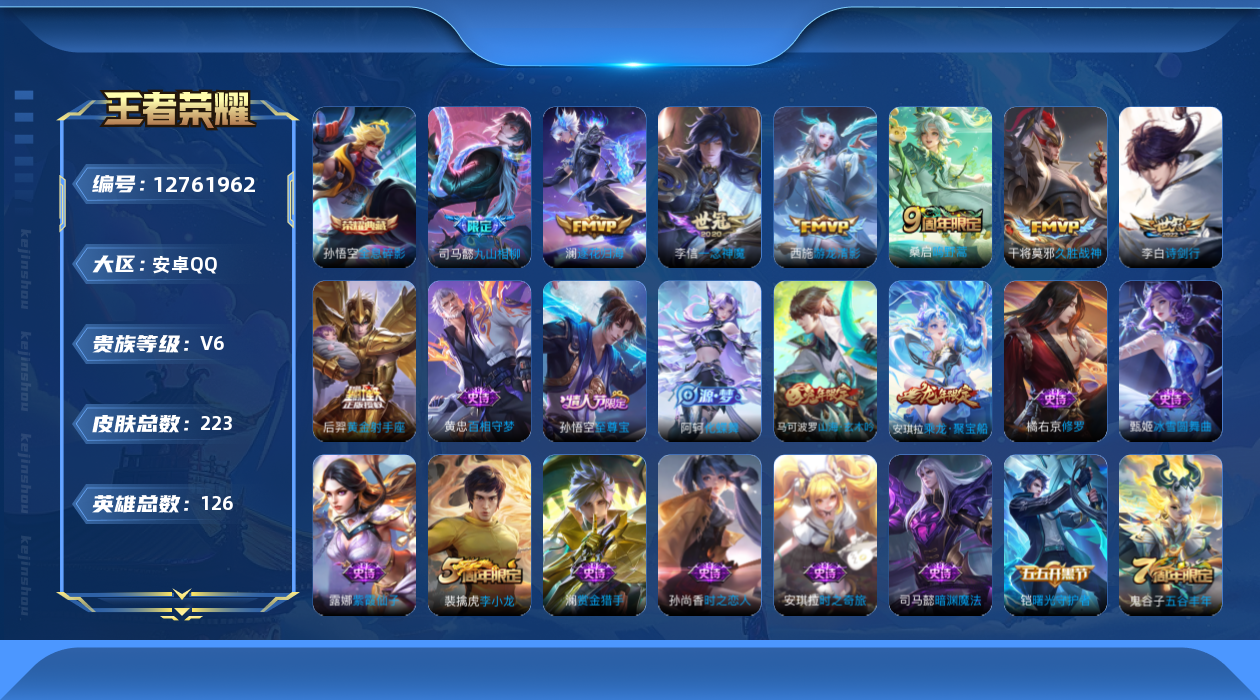 [12761962]【特价急出/详情看图】:安卓Q-V6-永恒钻石III段位-126英雄-223皮肤-1典藏-8传说-53史诗