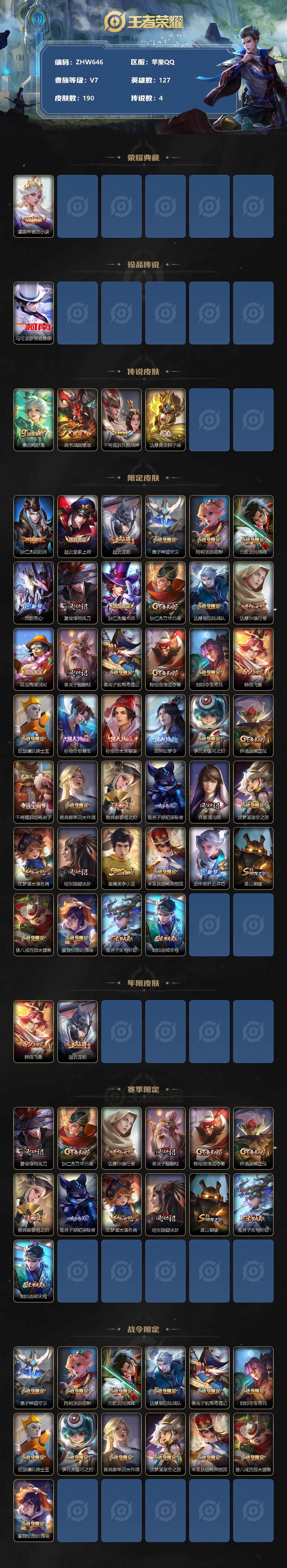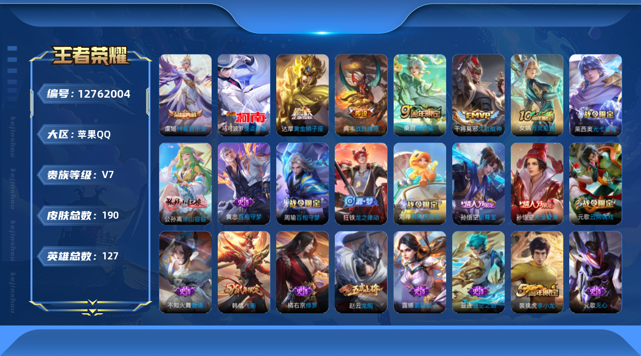 [12762004]【特价急出/详情看图】:苹果Q-V7-最强王者段位-127英雄-190皮肤-1典藏-1珍品传说-4传说-56史诗