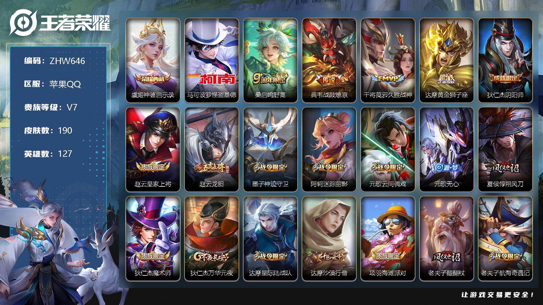 [12762004]【特价急出/详情看图】:苹果Q-V7-最强王者段位-127英雄-190皮肤-1典藏-1珍品传说-4传说-56史诗 【英雄全皮】:孙权全皮 【荣耀典藏】:虞姬神鉴启示录 【珍品传说】:马可波罗怪盗基德 【传说皮肤】:桑启鸣野蒿,典韦战鼓燎原,干将莫邪久胜战神,达摩黄金狮子座 【限定皮肤】:狄仁杰阴阳师,赵云皇家上将,赵云龙胆,墨子神迹守卫,阿轲迷踪丽影,元歌云间偶戏,元歌无心,夏侯惇朔风刀,狄仁杰魔术师,狄仁杰万华元夜,达摩星际陆战队,达摩沙漠行僧,项羽海滩派对,老夫子醍醐杖,老夫子航海奇遇记,程咬金演武夺筹,刘邦夺宝奇兵,韩信飞衡,亚瑟潮玩骑士王,孙悟空至尊宝,孙悟空大圣娶亲,后羿如梦令,李元芳银河之约,钟馗驱傩正仪,干将莫邪胡桃夹子,雅典娜单词大作战,雅典娜黎明之约,鬼谷子原初探秘者,弈星混沌棋,沈梦溪星空之诺,沈梦溪大漠名商,明世隐疑决卦,裴擒虎李小龙,米莱狄胡桃异想国,云中君纤云弄巧,盾山御銮,猪八戒西部大镖客,蒙犽狂想玩偶喵,鬼谷子天穹祈灯,刘邦剑破天穹 【年限皮肤】:韩信飞衡,赵云龙胆 【赛季限定】:夏侯惇朔风刀,狄仁杰万华元夜,达摩沙漠行僧,老夫子醍醐杖,程咬金演武夺筹,钟馗驱傩正仪,雅典娜黎明之约,鬼谷子原初探秘者,弈星混沌棋,沈梦溪大漠名商,明世隐疑决卦,盾山御銮,鬼谷子天穹祈灯,刘邦剑破天穹 【战令限定】:墨子神迹守卫,阿轲迷踪丽影,元歌云间偶戏,达摩星际陆战队,老夫子航海奇遇记,刘邦夺宝奇兵,亚瑟潮玩骑士王,李元芳银河之约,雅典娜单词大作战,沈梦溪星空之诺,米莱狄胡桃异想国,猪八戒西部大镖客,蒙犽狂想玩偶喵 【史诗皮肤】:露娜紫霞仙子,赵云皇家上将,赵云未来纪元,貂蝉圣诞恋歌,王昭君偶像歌手,狄仁杰魔术师,廉颇地狱岩魂,宫本武藏鬼剑武藏,孙尚香水果甜心,嬴政摇滚巨星,妲己魅力维加斯,妲己女仆咖啡,墨子金属风暴,吕布圣诞狂欢,张飞乱世虎臣,韩信白龙吟,孙悟空至尊宝,刘邦德古拉伯爵,夏侯惇乘风破浪,诸葛亮黄金分割率,亚瑟心灵战警,百里守约特工魅影,铠曙光守护者,李元芳逐浪之夏,程咬金功夫厨神,孙策猫狗日记,孙悟空大圣娶亲,伽罗箭羽风息,狄仁杰鹰眼统帅,李元芳银河之约,韩信飞衡,后羿如梦令,小乔青蛇,不知火舞魅语,阿轲迷踪丽影,橘右京修罗,赵云龙胆,蒙犽狂想玩偶喵,裴擒虎李小龙,云中君纤云弄巧,元歌云间偶戏,米莱狄胡桃异想国,老夫子航海奇遇记,杨戬天