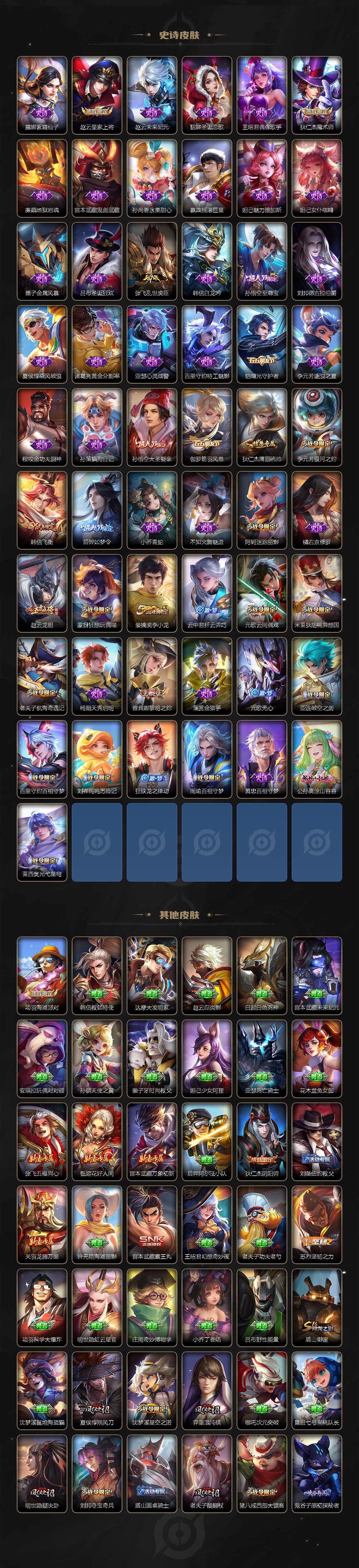 【史诗皮肤】:露娜紫霞仙子,赵云皇家上将,赵云未来纪元,貂蝉圣诞恋歌,王昭君偶像歌手,狄仁杰魔术师,廉颇地狱岩魂,宫本武藏鬼剑武藏,孙尚香水果甜心,嬴政摇滚巨星,妲己魅力维加斯,妲己女仆咖啡,墨子金属风暴,吕布圣诞狂欢,张飞乱世虎臣,韩信白龙吟,孙悟空至尊宝,刘邦德古拉伯爵,夏侯惇乘风破浪,诸葛亮黄金分割率,亚瑟心灵战警,百里守约特工魅影,铠曙光守护者,李元芳逐浪之夏,程咬金功夫厨神,孙策猫狗日记,孙悟空大圣娶亲,伽罗箭羽风息,狄仁杰鹰眼统帅,李元芳银河之约,韩信飞衡,后羿如梦令,小乔青蛇,不知火舞魅语,阿轲迷踪丽影,橘右京修罗,赵云龙胆,蒙犽狂想玩偶喵,裴擒虎李小龙,云中君纤云弄巧,元歌云间偶戏,米莱狄胡桃异想国,老夫子航海奇遇记,杨戬天