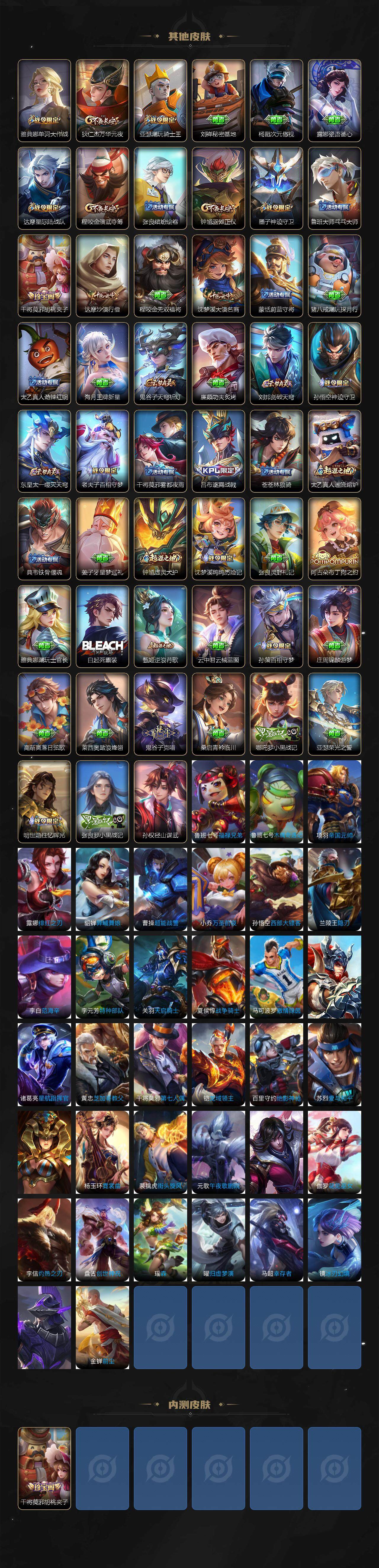 【限定皮肤】:狄仁杰阴阳师,赵云皇家上将,赵云龙胆,墨子神迹守卫,阿轲迷踪丽影,元歌云间偶戏,元歌无心,夏侯惇朔风刀,狄仁杰魔术师,狄仁杰万华元夜,达摩星际陆战队,达摩沙漠行僧,项羽海滩派对,老夫子醍醐杖,老夫子航海奇遇记,程咬金演武夺筹,刘邦夺宝奇兵,韩信飞衡,亚瑟潮玩骑士王,孙悟空至尊宝,孙悟空大圣娶亲,后羿如梦令,李元芳银河之约,钟馗驱傩正仪,干将莫邪胡桃夹子,雅典娜单词大作战,雅典娜黎明之约,鬼谷子原初探秘者,弈星混沌棋,沈梦溪星空之诺,沈梦溪大漠名商,明世隐疑决卦,裴擒虎李小龙,米莱狄胡桃异想国,云中君纤云弄巧,盾山御銮,猪八戒西部大镖客,蒙犽狂想玩偶喵,鬼谷子天穹祈灯,刘邦剑破天穹