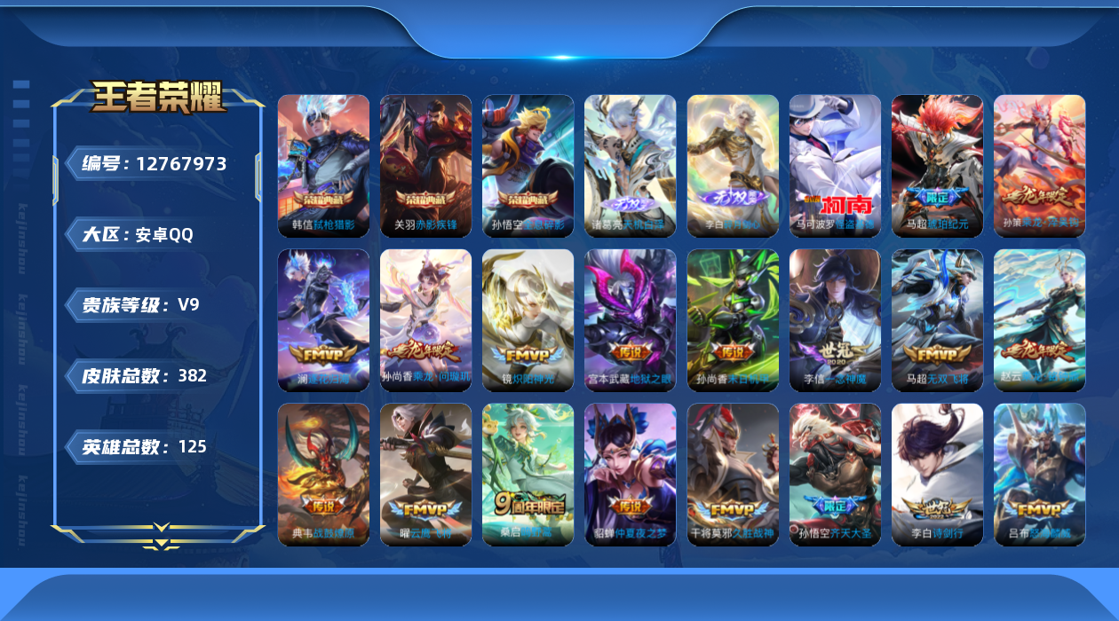 [12767973]安卓Q-V9-至尊星耀V段位-125英雄-382皮肤-3典藏-0珍品无双-2无双-1珍品传说-33传说-114史诗
