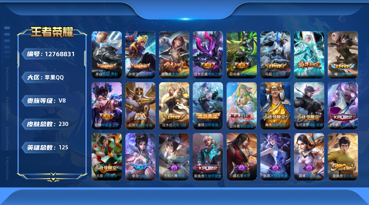 [12768831]苹果Q-V3-最强王者段位-125英雄-230皮肤-2典藏-0珍品无双-0无双-0珍品传说-10传说-60史诗