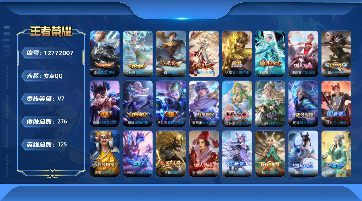 [12772007]安卓Q-V7-最强王者段位-125英雄-276皮肤-1典藏-0珍品无双-0无双-0珍品传说-10传说-76史诗