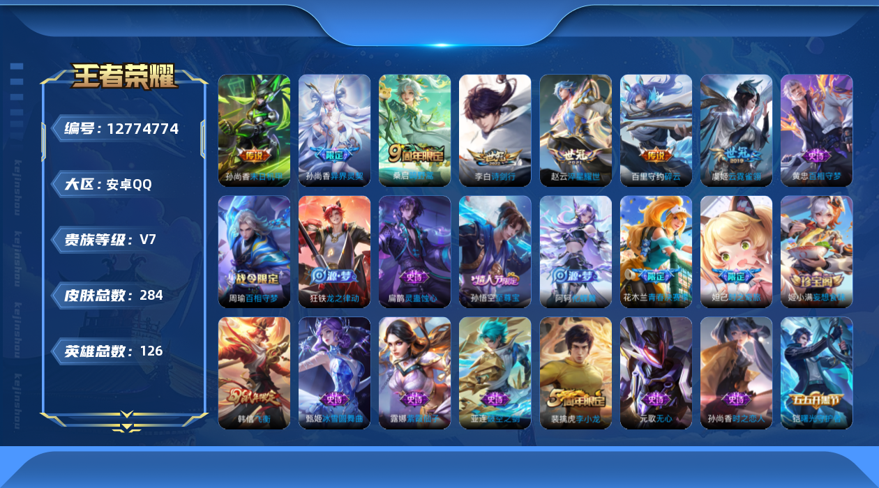 [12774774]安卓Q-V7-至尊星耀III段位-126英雄-284皮肤-0典藏-0珍品无双-0无双-0珍品传说-7传说-70史诗