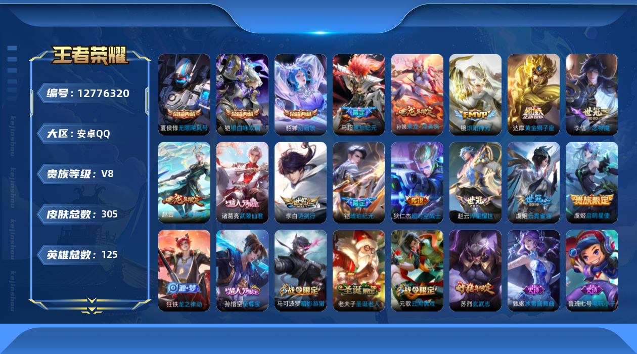 [12776320]安卓Q-V6-最强王者段位-125英雄-305皮肤-3典藏-0珍品无双-0无双-0珍品传说-13传说-70史诗