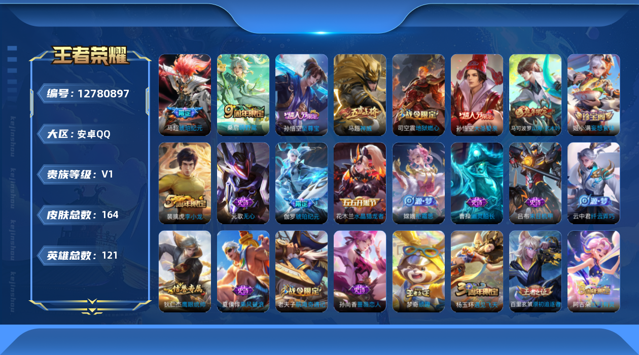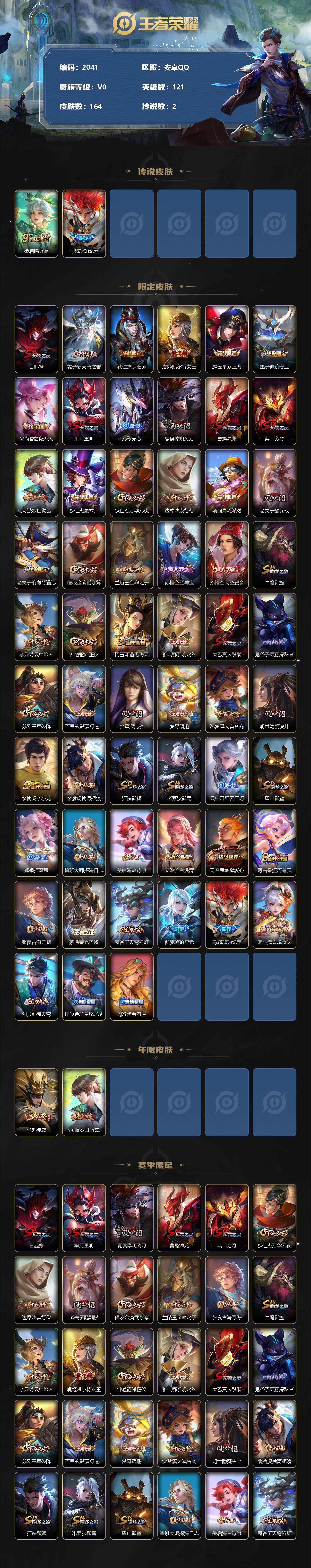 [12780897]安卓Q-V0-荣耀黄金I段位-121英雄-164皮肤-0典藏-0珍品无双-0无双-0珍品传说-2传说-37史诗