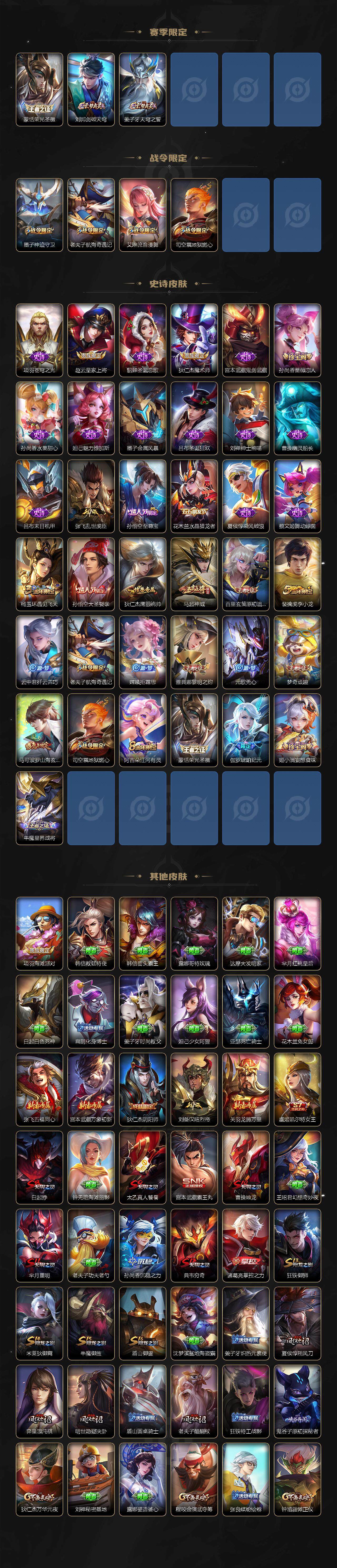 【赛季限定】:白起狰,芈月重明,夏侯惇朔风刀,曹操烛龙,典韦穷奇,狄仁杰万华元夜,达摩沙漠行僧,老夫子醍醐杖,程咬金演武夺筹,兰陵王金庭之子,张良古海寻踪,牛魔御旌,李元芳云中旅人,虞姬凯尔特女王,钟馗驱傩正仪,雅典娜黎明之约,太乙真人饕餮,鬼谷子原初探秘者,苏烈千军破阵,百里玄策原初追逐者,弈星混沌棋,梦奇顽趣,沈梦溪大漠名商,明世隐疑决卦,裴擒虎擒涛扼浪,狂铁御狮,米莱狄御霄,盾山御銮,鲁班大师探海日志,桑启海盐诗旅,鬼谷子天穹祈灯,蒙恬荣光圣徽,刘邦剑破天穹,姜子牙天穹之誓