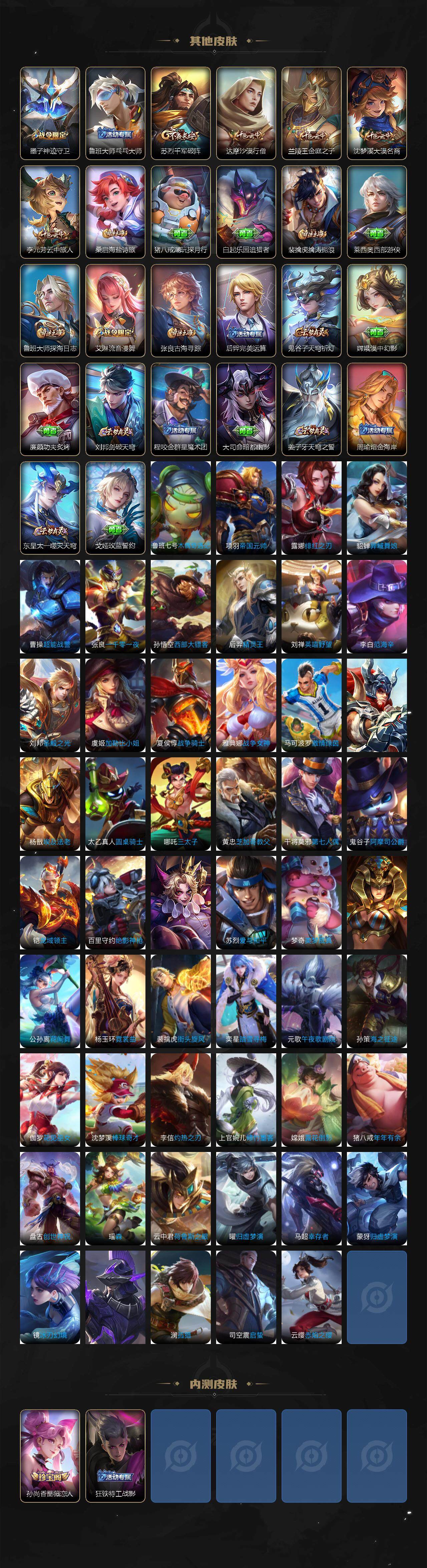 【限定皮肤】:白起狰,姜子牙天穹之誓,狄仁杰阴阳师,虞姬凯尔特女王,赵云皇家上将,墨子神迹守卫,孙尚香蔷薇恋人,芈月重明,元歌无心,夏侯惇朔风刀,曹操烛龙,典韦穷奇,马可波罗山海玄木吟,狄仁杰魔术师,狄仁杰万华元夜,达摩沙漠行僧,项羽海滩派对,老夫子醍醐杖,老夫子航海奇遇记,程咬金演武夺筹,兰陵王金庭之子,孙悟空至尊宝,孙悟空大圣娶亲,牛魔御旌,李元芳云中旅人,钟馗驱傩正仪,杨玉环遇见飞天,雅典娜黎明之约,太乙真人饕餮,鬼谷子原初探秘者,苏烈千军破阵,百里玄策原初追逐者,弈星混沌棋,梦奇顽趣,沈梦溪大漠名商,明世隐疑决卦,裴擒虎李小龙,裴擒虎擒涛扼浪,狂铁御狮,米莱狄御霄,云中君纤云弄巧,盾山御銮,嫦娥拒霜思,鲁班大师探海日志,桑启海盐诗旅,艾琳流音漫舞,司空震地狱燃心,阿古朵江河有灵,张良古海寻踪,蒙恬荣光圣徽,鬼谷子天穹祈灯,伽罗琥珀纪元,马超琥珀纪元,姬小满妄想食味,刘邦剑破天穹,程咬金群星魔术团,周瑜熔金海岸