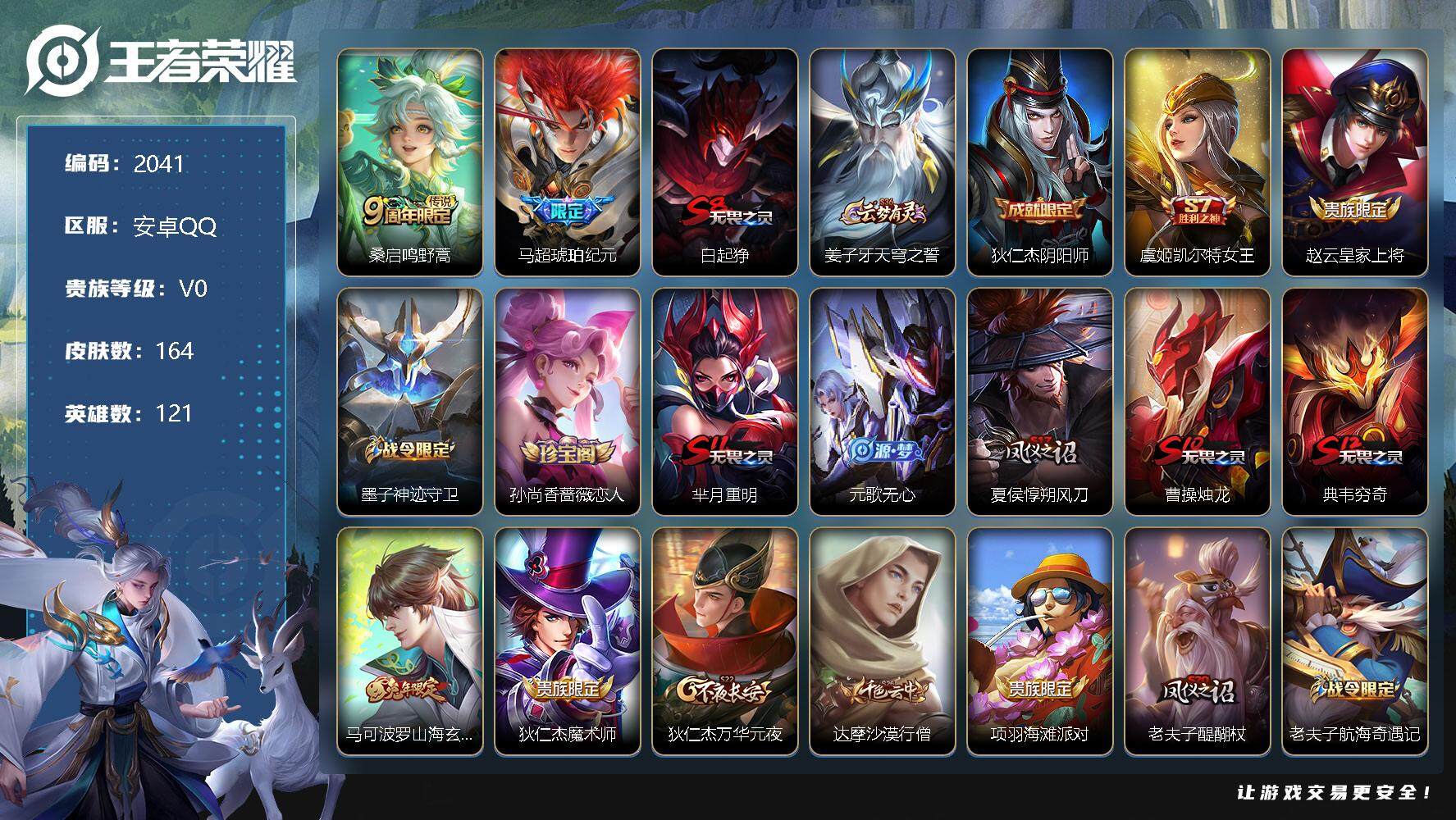 [12780897]安卓Q-V0-荣耀黄金I段位-121英雄-164皮肤-0典藏-0珍品无双-0无双-0珍品传说-2传说-37史诗 【传说皮肤】:桑启鸣野蒿,马超琥珀纪元 【限定皮肤】:白起狰,姜子牙天穹之誓,狄仁杰阴阳师,虞姬凯尔特女王,赵云皇家上将,墨子神迹守卫,孙尚香蔷薇恋人,芈月重明,元歌无心,夏侯惇朔风刀,曹操烛龙,典韦穷奇,马可波罗山海玄木吟,狄仁杰魔术师,狄仁杰万华元夜,达摩沙漠行僧,项羽海滩派对,老夫子醍醐杖,老夫子航海奇遇记,程咬金演武夺筹,兰陵王金庭之子,孙悟空至尊宝,孙悟空大圣娶亲,牛魔御旌,李元芳云中旅人,钟馗驱傩正仪,杨玉环遇见飞天,雅典娜黎明之约,太乙真人饕餮,鬼谷子原初探秘者,苏烈千军破阵,百里玄策原初追逐者,弈星混沌棋,梦奇顽趣,沈梦溪大漠名商,明世隐疑决卦,裴擒虎李小龙,裴擒虎擒涛扼浪,狂铁御狮,米莱狄御霄,云中君纤云弄巧,盾山御銮,嫦娥拒霜思,鲁班大师探海日志,桑启海盐诗旅,艾琳流音漫舞,司空震地狱燃心,阿古朵江河有灵,张良古海寻踪,蒙恬荣光圣徽,鬼谷子天穹祈灯,伽罗琥珀纪元,马超琥珀纪元,姬小满妄想食味,刘邦剑破天穹,程咬金群星魔术团,周瑜熔金海岸 【年限皮肤】:马超神威,马可波罗山海玄木吟 【赛季限定】:白起狰,芈月重明,夏侯惇朔风刀,曹操烛龙,典韦穷奇,狄仁杰万华元夜,达摩沙漠行僧,老夫子醍醐杖,程咬金演武夺筹,兰陵王金庭之子,张良古海寻踪,牛魔御旌,李元芳云中旅人,虞姬凯尔特女王,钟馗驱傩正仪,雅典娜黎明之约,太乙真人饕餮,鬼谷子原初探秘者,苏烈千军破阵,百里玄策原初追逐者,弈星混沌棋,梦奇顽趣,沈梦溪大漠名商,明世隐疑决卦,裴擒虎擒涛扼浪,狂铁御狮,米莱狄御霄,盾山御銮,鲁班大师探海日志,桑启海盐诗旅,鬼谷子天穹祈灯,蒙恬荣光圣徽,刘邦剑破天穹,姜子牙天穹之誓 【战令限定】:墨子神迹守卫,老夫子航海奇遇记,艾琳流音漫舞,司空震地狱燃心 【史诗皮肤】:项羽苍穹之光,赵云皇家上将,貂蝉圣诞恋歌,狄仁杰魔术师,宫本武藏鬼剑武藏,孙尚香蔷薇恋人,孙尚香水果甜心,妲己魅力维加斯,墨子金属风暴,吕布圣诞狂欢,刘禅绅士熊喵,曹操幽灵船长,吕布末日机甲,张飞乱世虎臣,孙悟空至尊宝,花木兰水晶猎龙者,夏侯惇乘风破浪,蔡文姬舞动绿茵,杨玉环遇见飞天,孙悟空大圣娶亲,狄仁杰鹰眼统帅,马超神威,百里玄策原初追逐者,裴擒虎李小龙,云中君纤云弄巧,老夫子航海奇遇记,